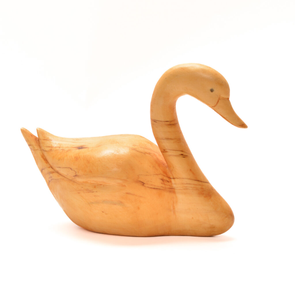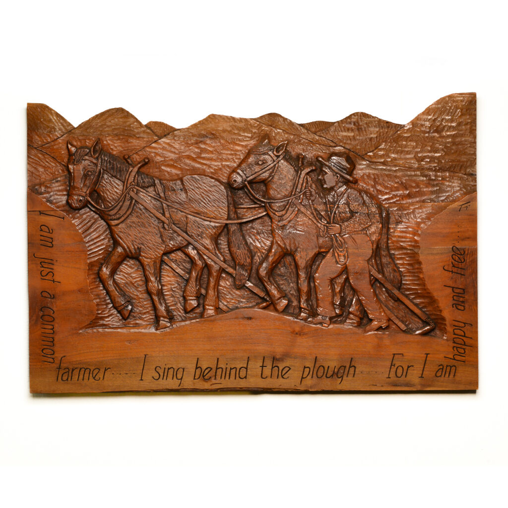 The exhibition also highlights the deep historical ties between the Folk School and the Southern Highland Craft Guild. Several founders of the Folk School were closely involved in the Guild’s earliest years, and works by two of them are featured in the exhibition. These include a carving attributed to Olive Dame Campbell, whose vision helped shape the regional craft revival, and a folk-dance publication by Marguerite Butler Bidstrup and her husband, reflecting the Folk School’s holistic approach to craft, music, and movement as living cultural expressions.