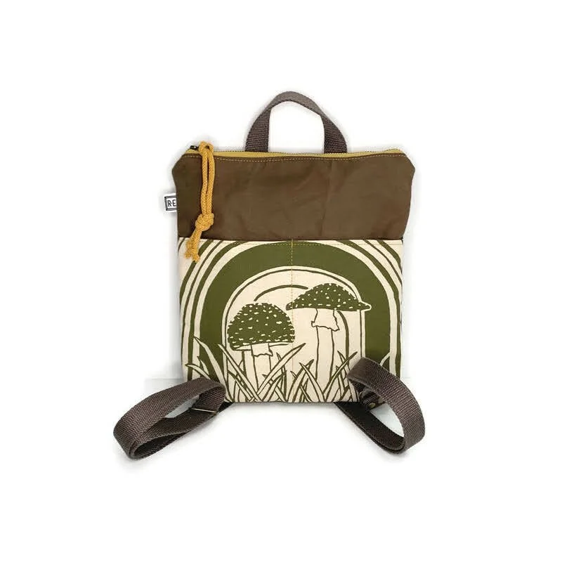 Waxed canvas, hand printed mini backpack. Designed, cut, printed, and stitched in Western North Carolina. All bags are made of waxed and hand printed canvas. Waxed canvas is cotton canvas with a thin wax coating on both sides to make the fabric weather resistant, originally created for outdoor and military use. The pattern is created using screen-prints. Rachel designs a drawing, then creates a screen and hand-prints each one in a wide range of colors. The straps are super durable made of woven cotton. The waxed canvas is not machine washable or dry cleanable. Spot treating is recommended.
