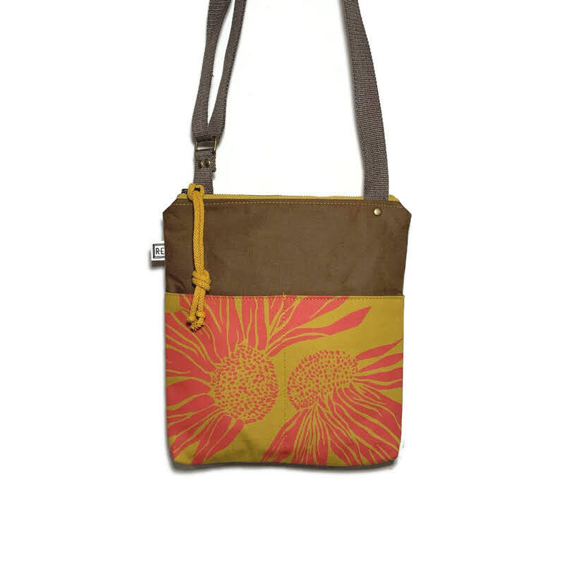 Waxed canvas, hand printed shoulder/cross body bag. Designed, cut, printed, and stitched in Western North Carolina. All bags are made of waxed and hand printed canvas. Waxed canvas is cotton canvas with a thin wax coating on both sides to make the fabric weather resistant, originally created for outdoor and military use. The pattern is created using screen-prints. Rachel designs a drawing, then creates a screen and hand-prints each one in a wide range of colors. The straps are super durable made of woven cotton. The waxed canvas is not machine washable or dry cleanable. Spot treating is recommended.