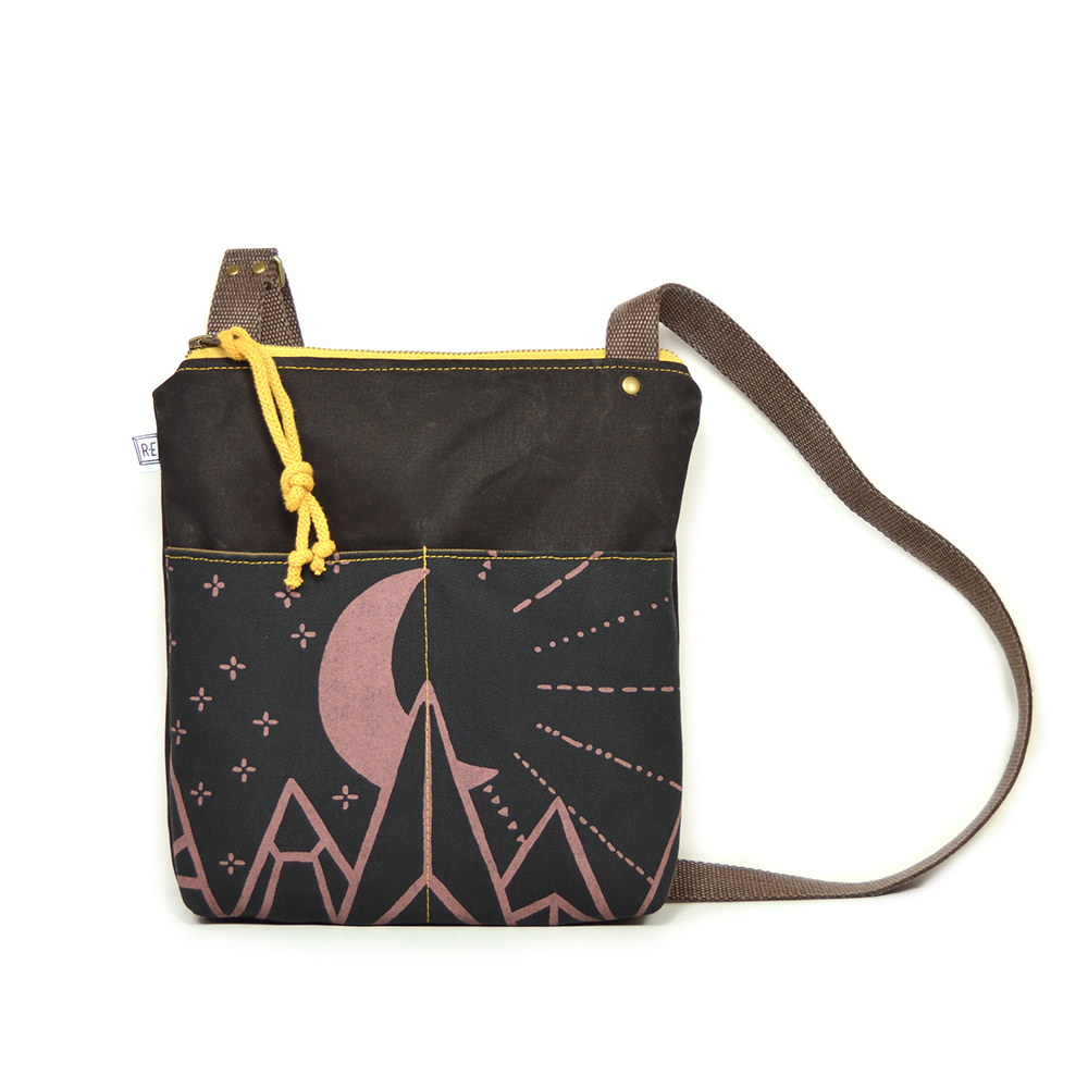 Waxed canvas, hand printed shoulder/cross body bag. Designed, cut, printed, and stitched in Western North Carolina. All bags are made of waxed and hand printed canvas. Waxed canvas is cotton canvas with a thin wax coating on both sides to make the fabric weather resistant, originally created for outdoor and military use. The pattern is created using screen-prints. Rachel designs a drawing, then creates a screen and hand-prints each one in a wide range of colors. The straps are super durable made of woven cotton. The waxed canvas is not machine washable or dry cleanable. Spot treating is recommended.