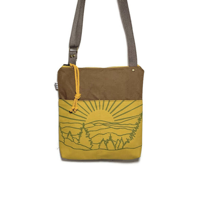 Waxed canvas, hand printed shoulder/cross body bag. Designed, cut, printed, and stitched in Western North Carolina. All bags are made of waxed and hand printed canvas. Waxed canvas is cotton canvas with a thin wax coating on both sides to make the fabric weather resistant, originally created for outdoor and military use. The pattern is created using screen-prints. Rachel designs a drawing, then creates a screen and hand-prints each one in a wide range of colors. The straps are super durable made of woven cotton. The waxed canvas is not machine washable or dry cleanable. Spot treating is recommended.