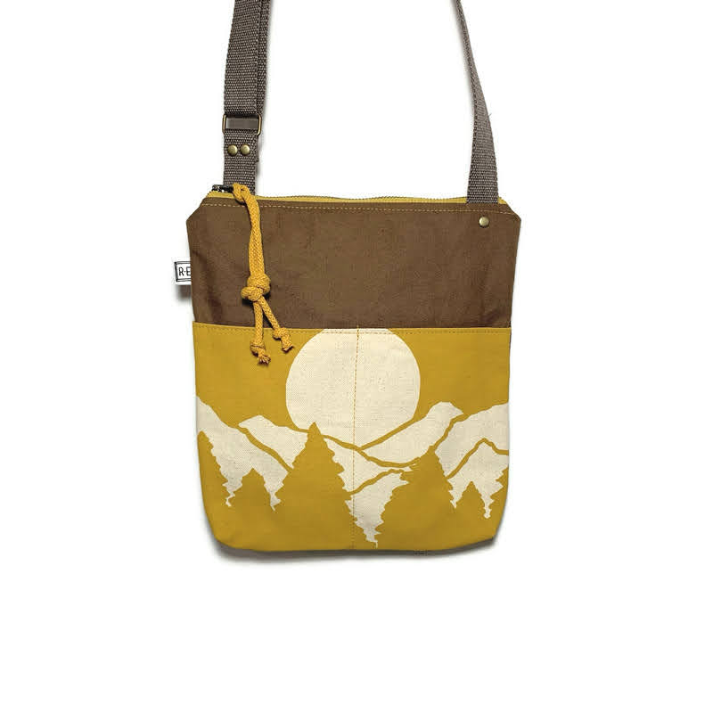 Waxed canvas, hand printed shoulder/cross body bag. Designed, cut, printed, and stitched in Western North Carolina. All bags are made of waxed and hand printed canvas. Waxed canvas is cotton canvas with a thin wax coating on both sides to make the fabric weather resistant, originally created for outdoor and military use. The pattern is created using screen-prints. Rachel designs a drawing, then creates a screen and hand-prints each one in a wide range of colors. The straps are super durable made of woven cotton. The waxed canvas is not machine washable or dry cleanable. Spot treating is recommended.