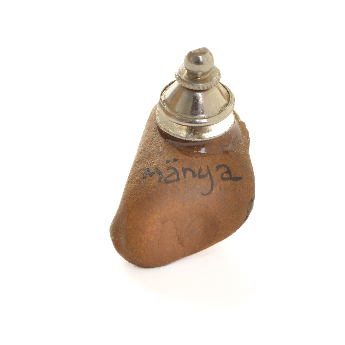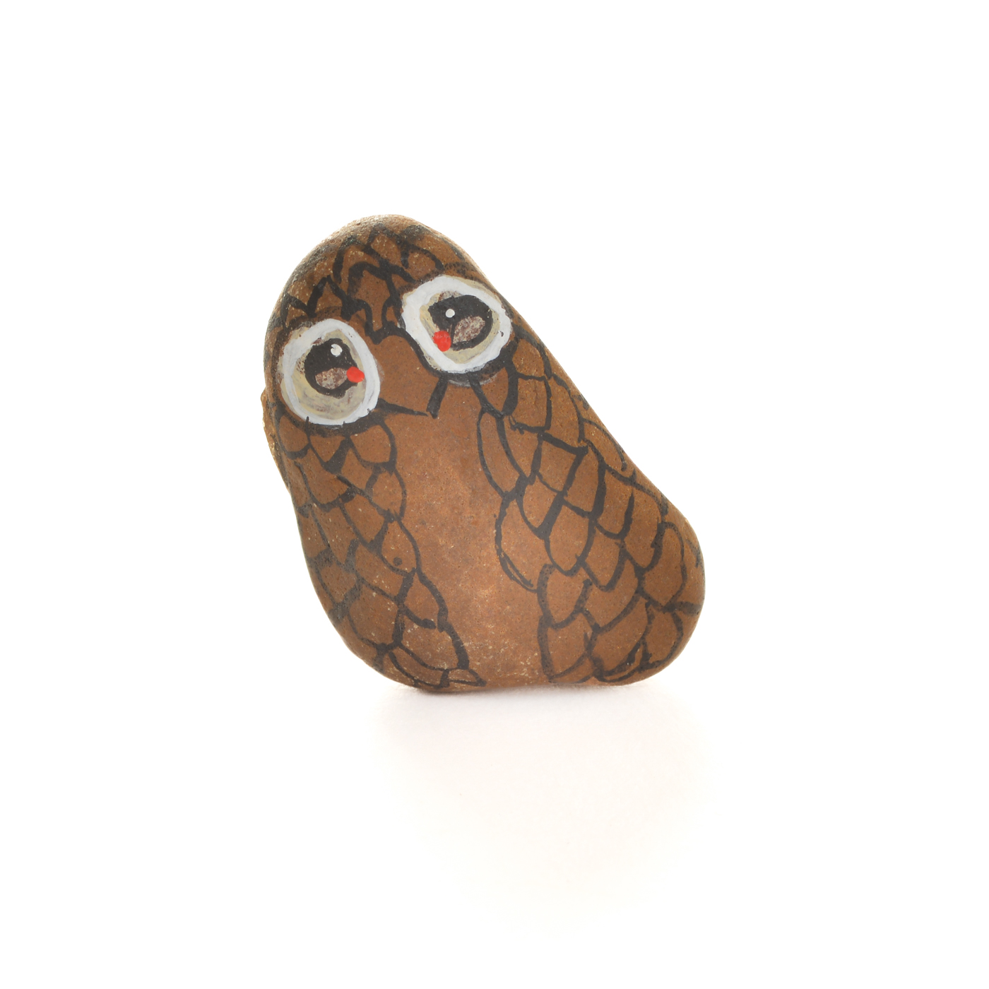 Hand painted river rock owl pin by Mänya Pirkle of Tennessee. Each pin features a natural river stone sourced from the mountains, transformed into a whimsical owl with unique features. No two owls are exactly alike, making each pin a special, wearable piece of folk art.