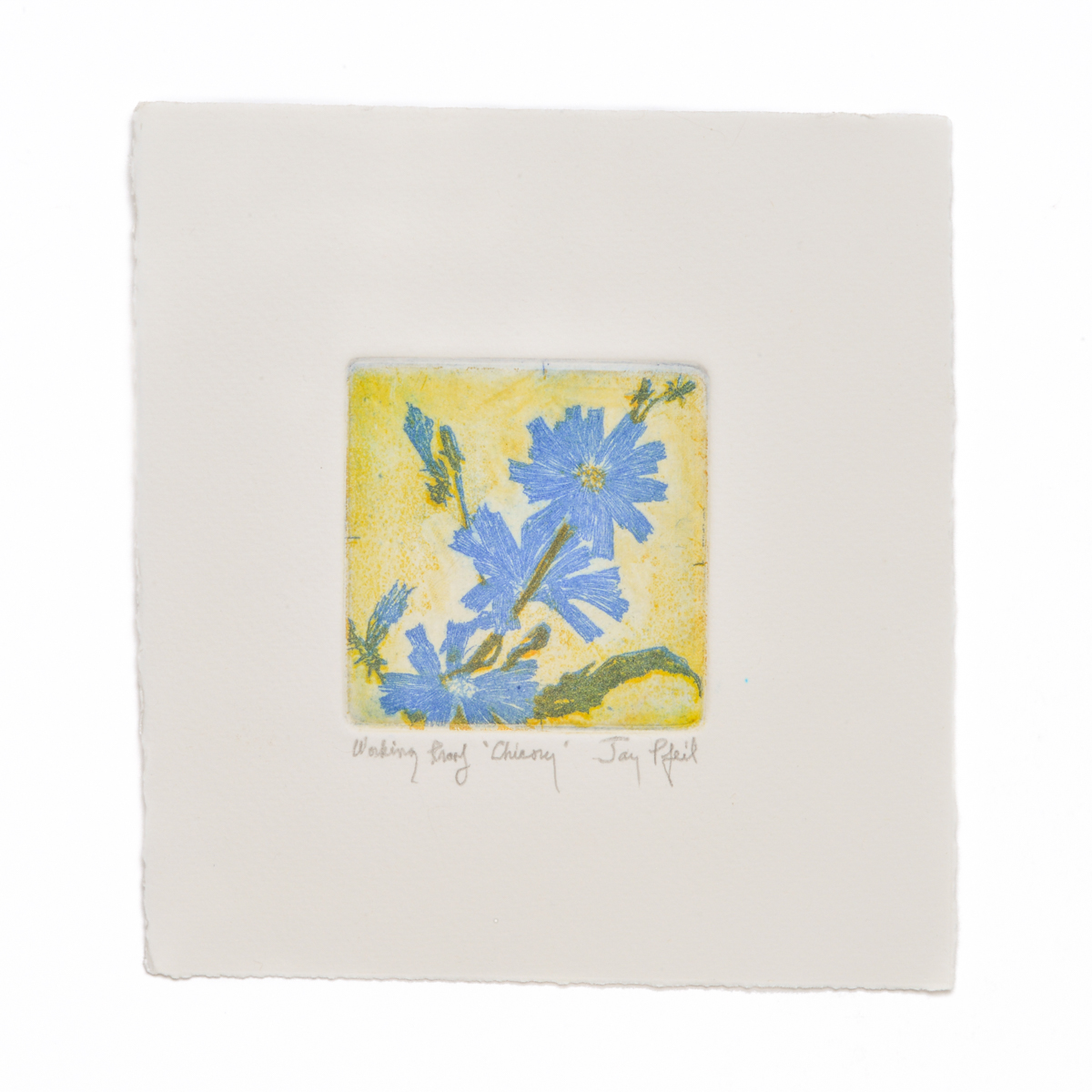 ‘Chicory’ is a 3 plate soft-ground etching and engraving printed on rag paper. Artist Jay Pfeil created this on one of her many hikes through these mountains. She is in the process of printing an edition of 95 signed, numbered, and hand-pulled intaglio prints.