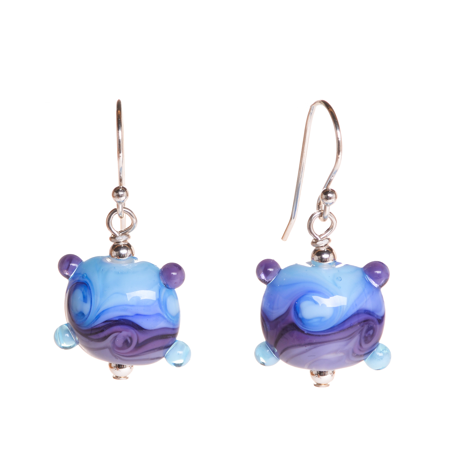 These swirled blue and purple handmade glass bead earrings were inspired by the works of Van Gogh. Teresa Brittain creates glass beads over a torch, using the centuries-old technique of lampworking, then combines the beads with sterling silver findings and chains to create unique pieces of wearable art.