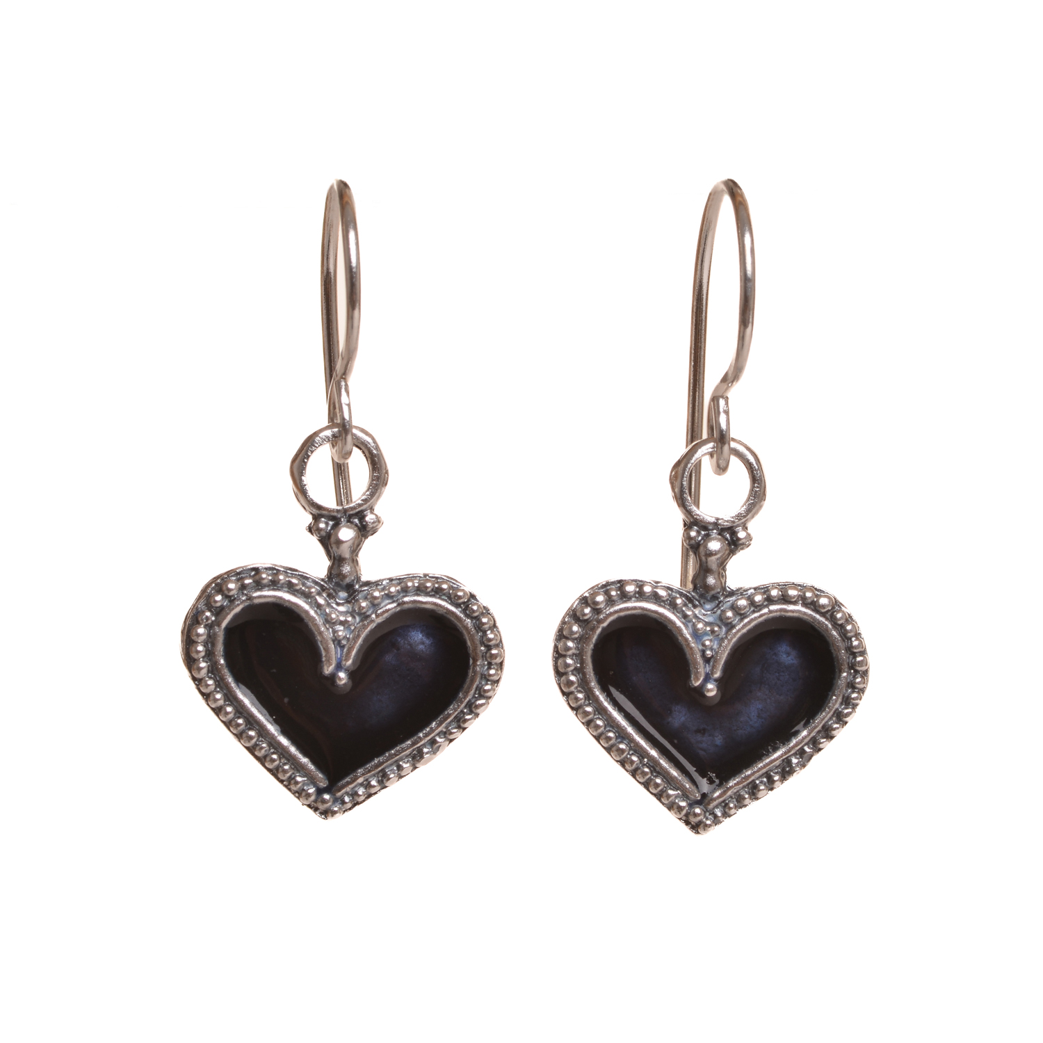 These are cast from a wax mold of a granulated heart made using the ancient technique of precision fusing called granulation. Each piece is cast in sterling silver and then carefully polished, cleaned, and packed with wet powdered glass, which is then fused in a kiln. The earrings are then sanded and heated in the kiln again, and then a final polish and cleaning after attaching a sterling silver forged French hook clasp. These are lightweight with great dangle movement.