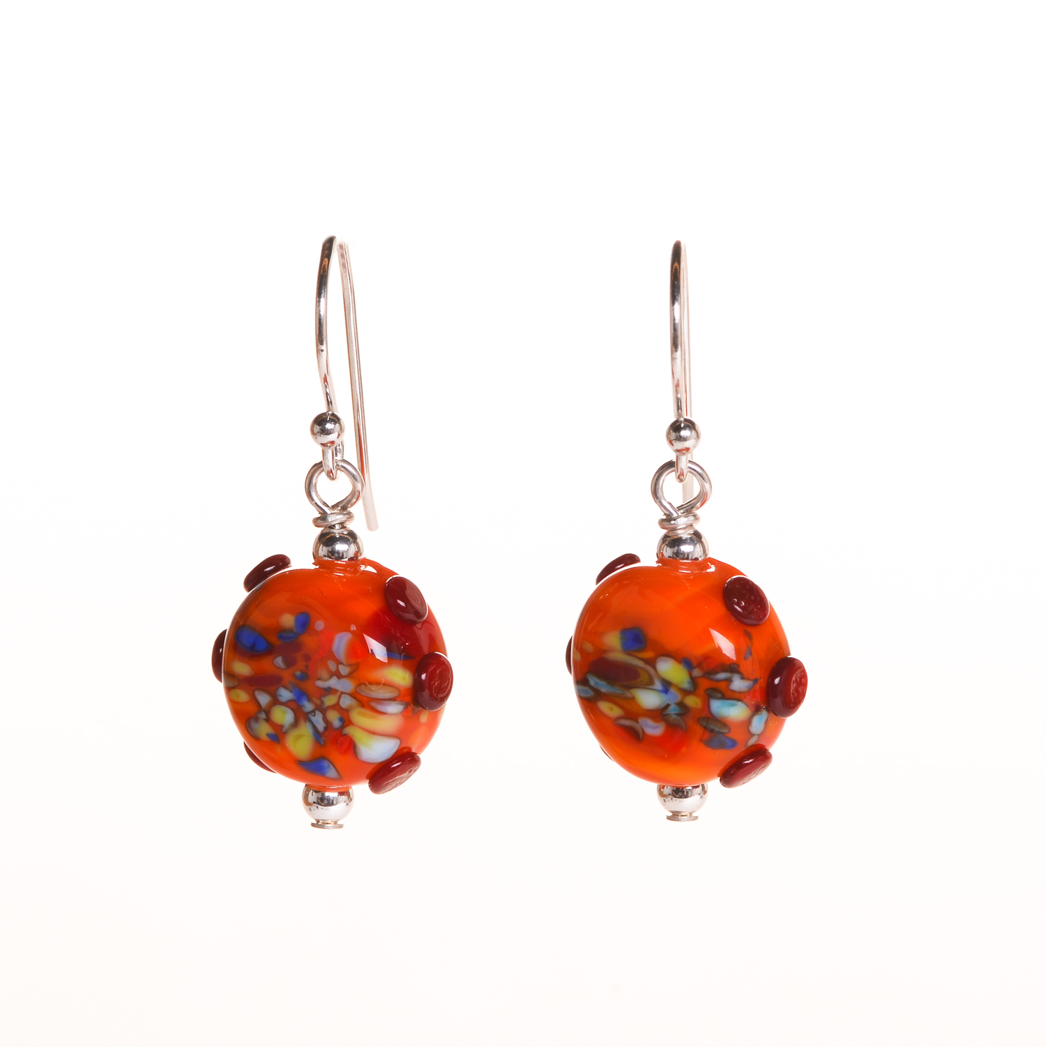 Handmade orange button tab glass bead earrings created over a torch. Teresa Brittain creates glass beads over a torch, using the centuries-old technique of lampworking, then combines the beads with sterling silver findings and chains to create unique pieces of wearable art.