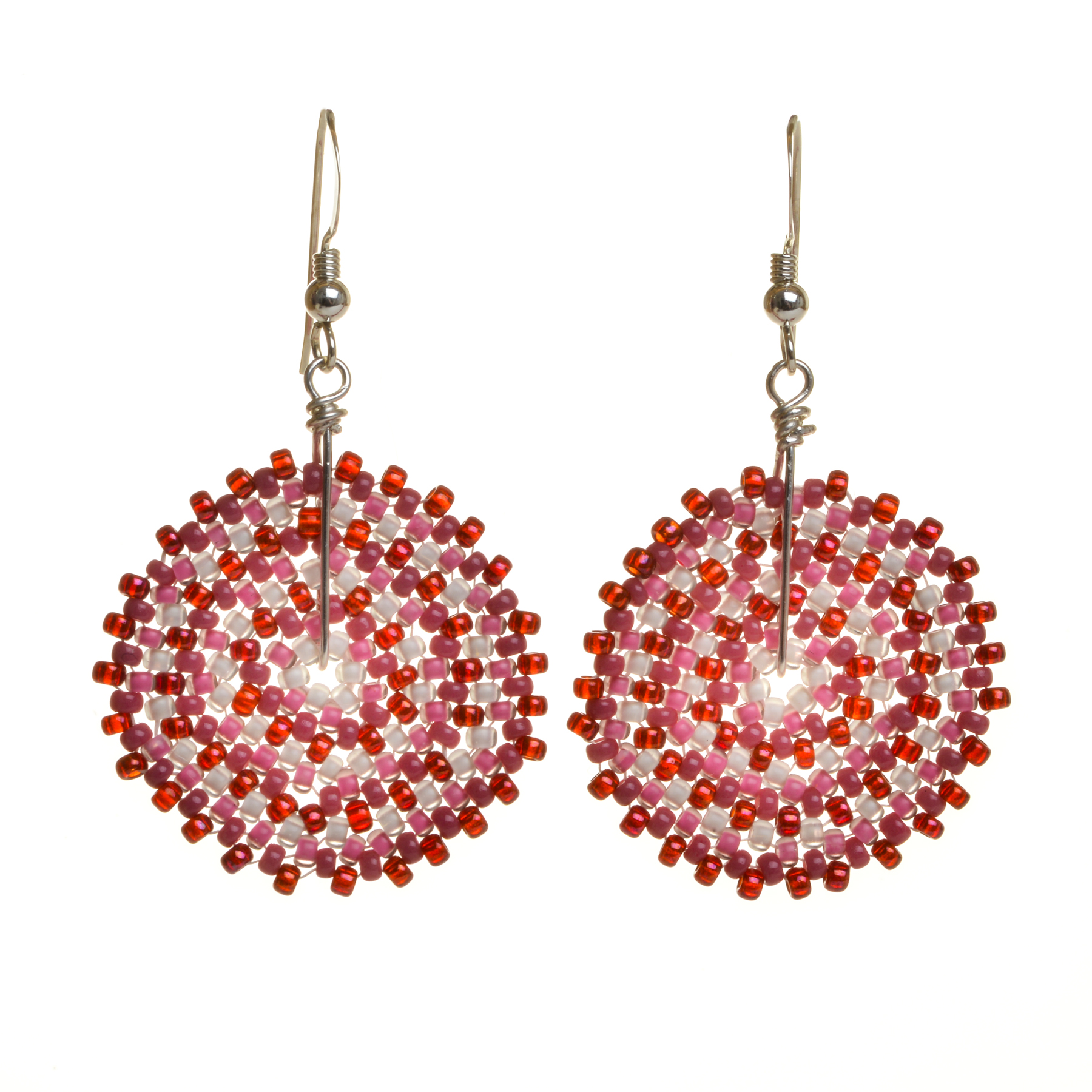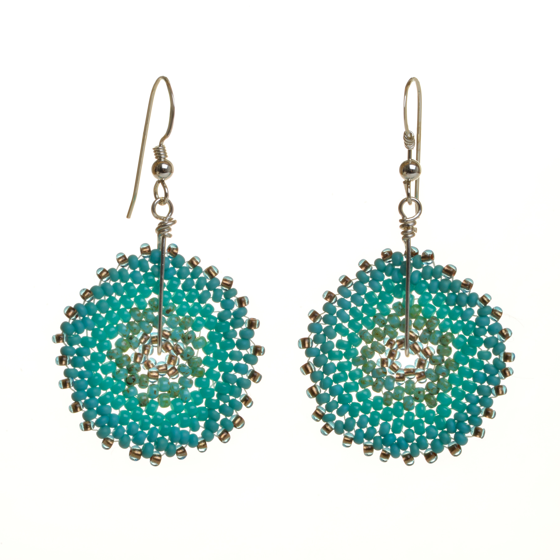 Round disc earrings featuring handwoven glass seed beads by jeweler Leslie Fawcett of Tennessee. With a needle and nylon thread, Leslie takes tiny glass seed beads and weaves them into larger beads that are then rolled up and sewn together. The use of the peyote stitch allows the ends of the rectangle to interlock when sewn together, and repeated passes through the beads reinforce the whole. Different colors available.