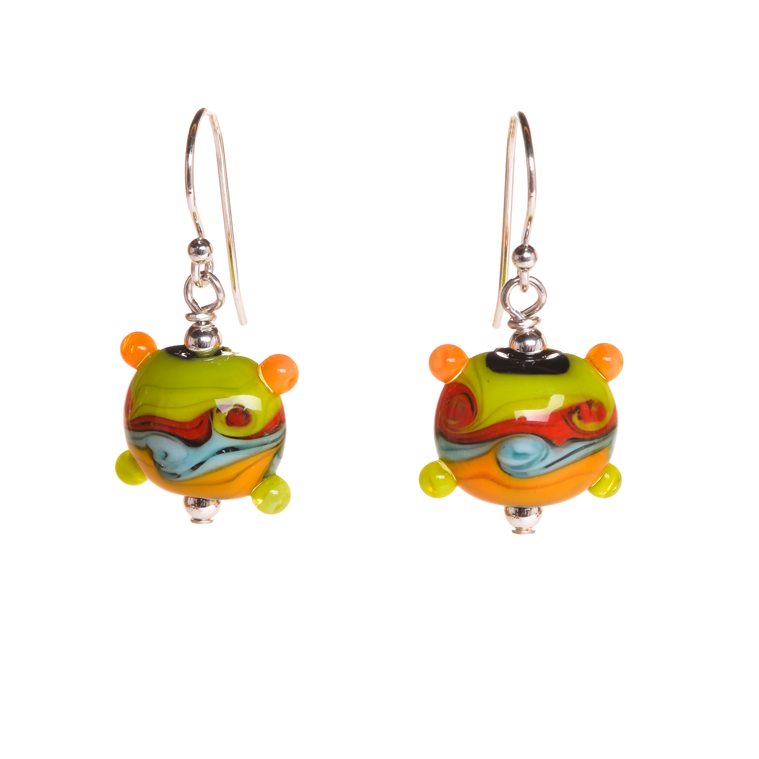 These multicolor handmade glass bead earrings were inspired by the works of Van Gogh. Teresa Brittain creates glass beads over a torch, using the centuries-old technique of lampworking, then combines the beads with sterling silver findings and chains to create unique pieces of wearable art.