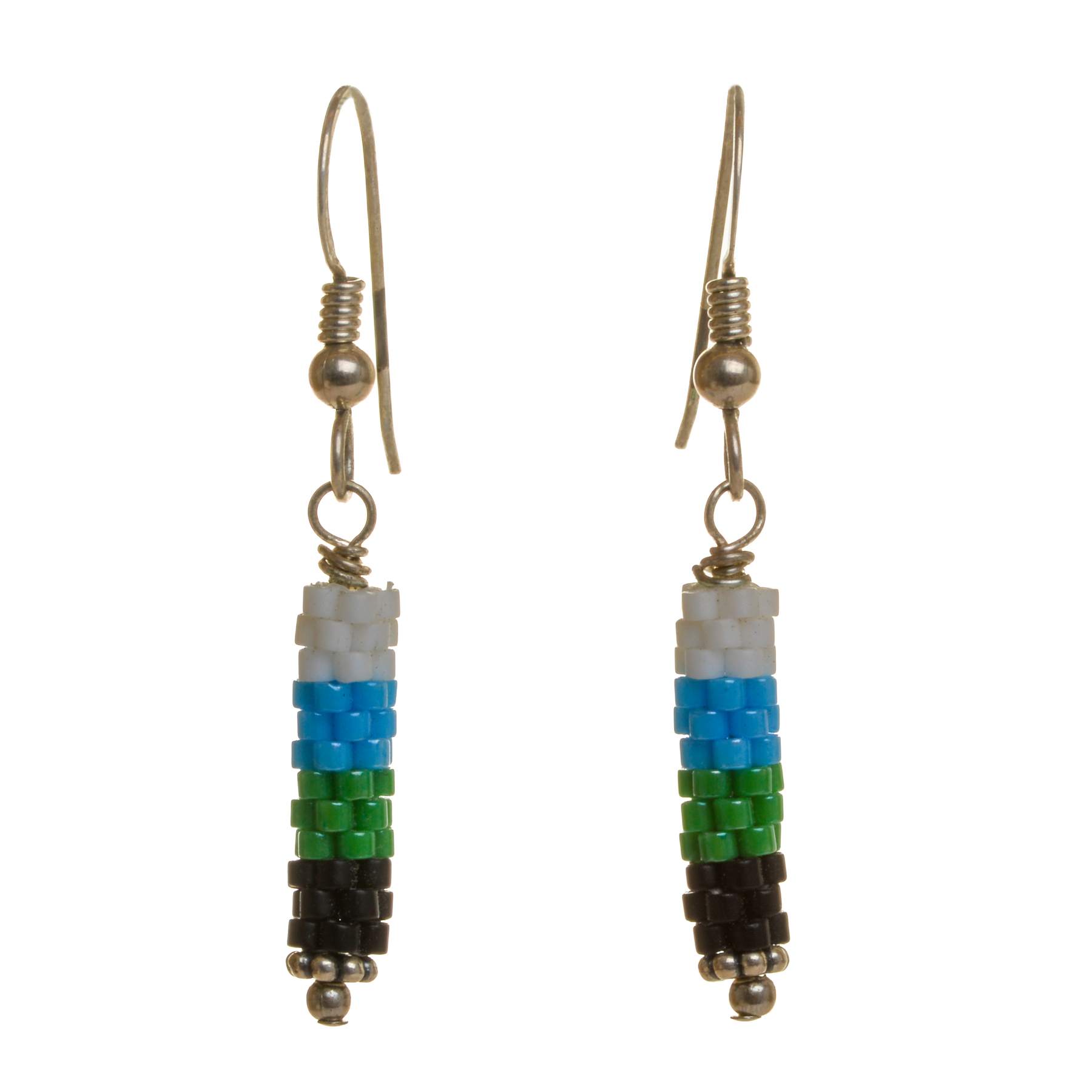Round tube earrings featuring handwoven glass seed beads by jeweler Leslie Fawcett of Tennessee. With a needle and nylon thread, Leslie takes tiny glass seed beads and weaves them into larger beads that are then rolled up and sewn together. The use of the peyote stitch allows the ends of the rectangle to interlock when sewn together, and repeated passes through the beads reinforce the whole. Different colors available.