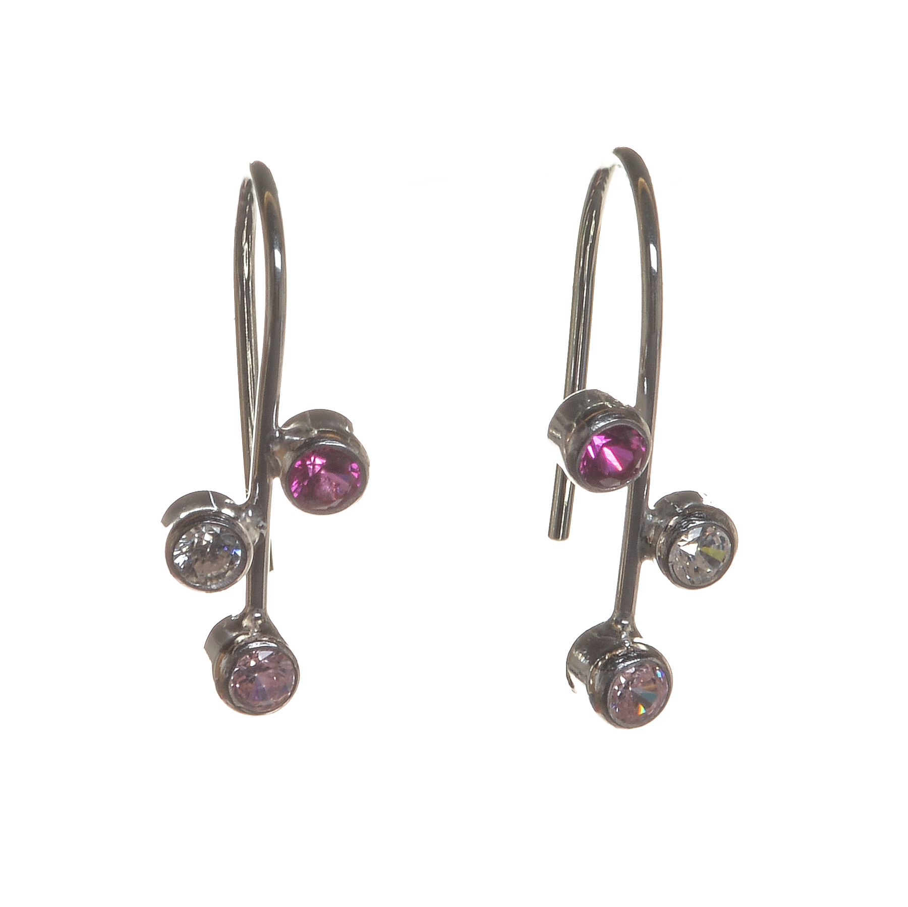 Delicate and modern, these sterling silver earrings feature a slender silver hook design accented with three sparkling stones in ruby, cubic zirconia, and pink topaz, biologically inspired and designed by Charity Hall of Virginia.