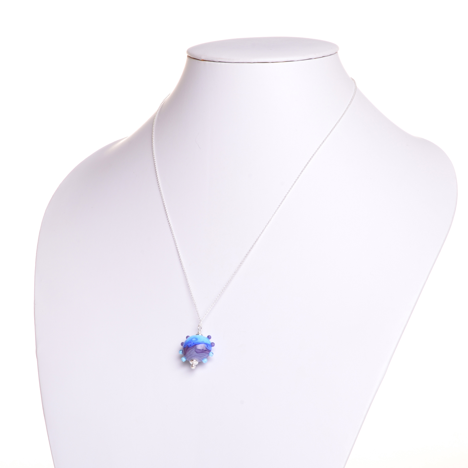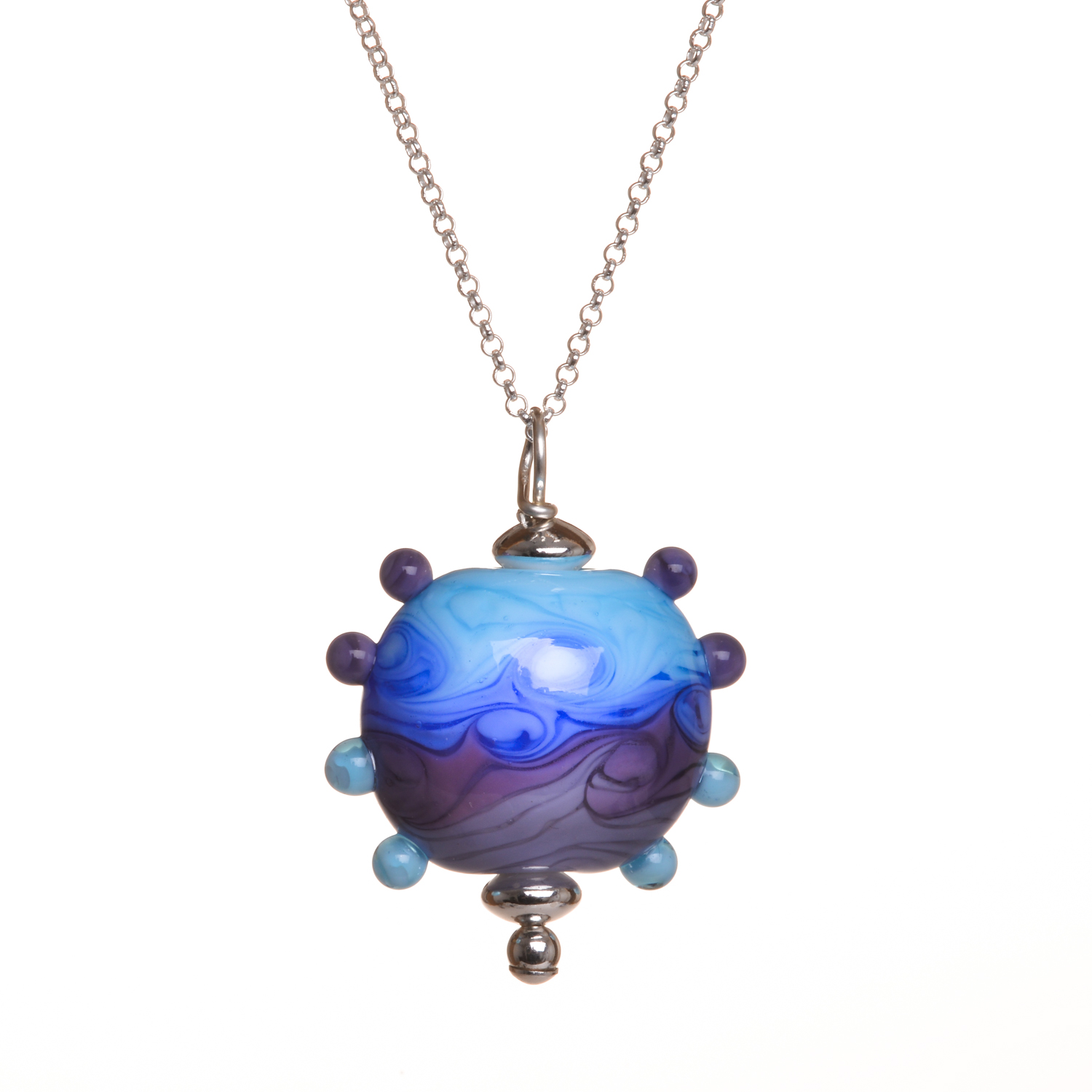 This swirled blue and purple handmade glass bead pendant is inspired by the works of Van Gogh. Teresa Brittain creates glass beads over a torch, using the centuries-old technique of lampworking, then combines the beads with sterling silver findings and chains to create unique pieces of wearable art.