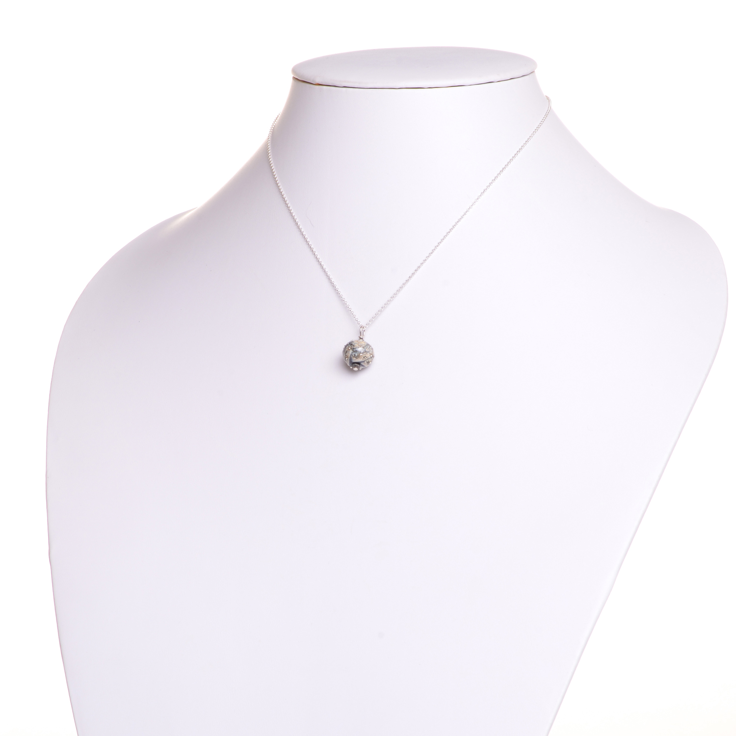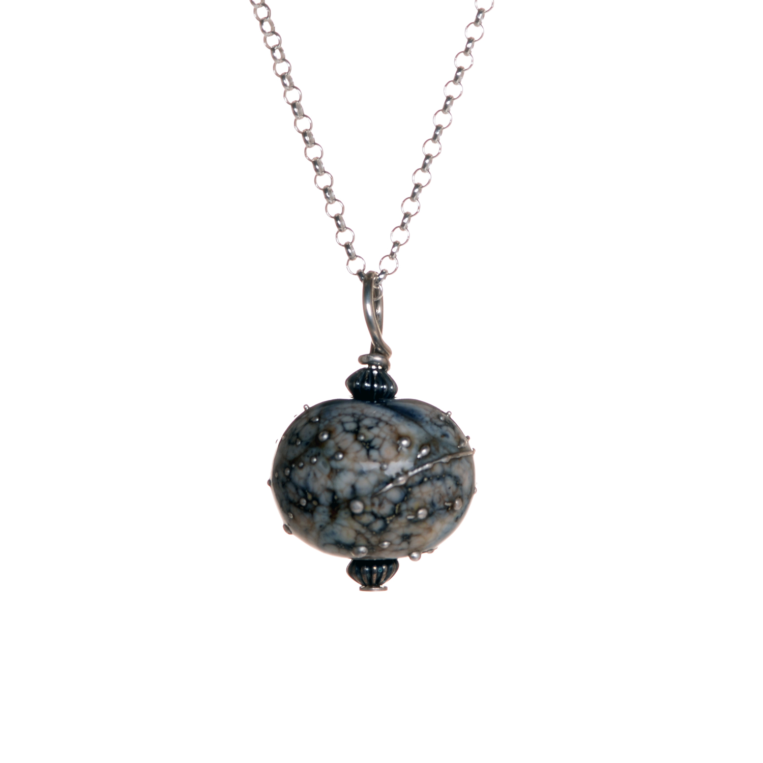 Mini black/ivory glass bead with frit pendant created over a torch. Teresa Brittain creates glass beads over a torch, using the centuries-old technique of lampworking, then combines the beads with sterling silver findings and chains to create unique pieces of wearable art.