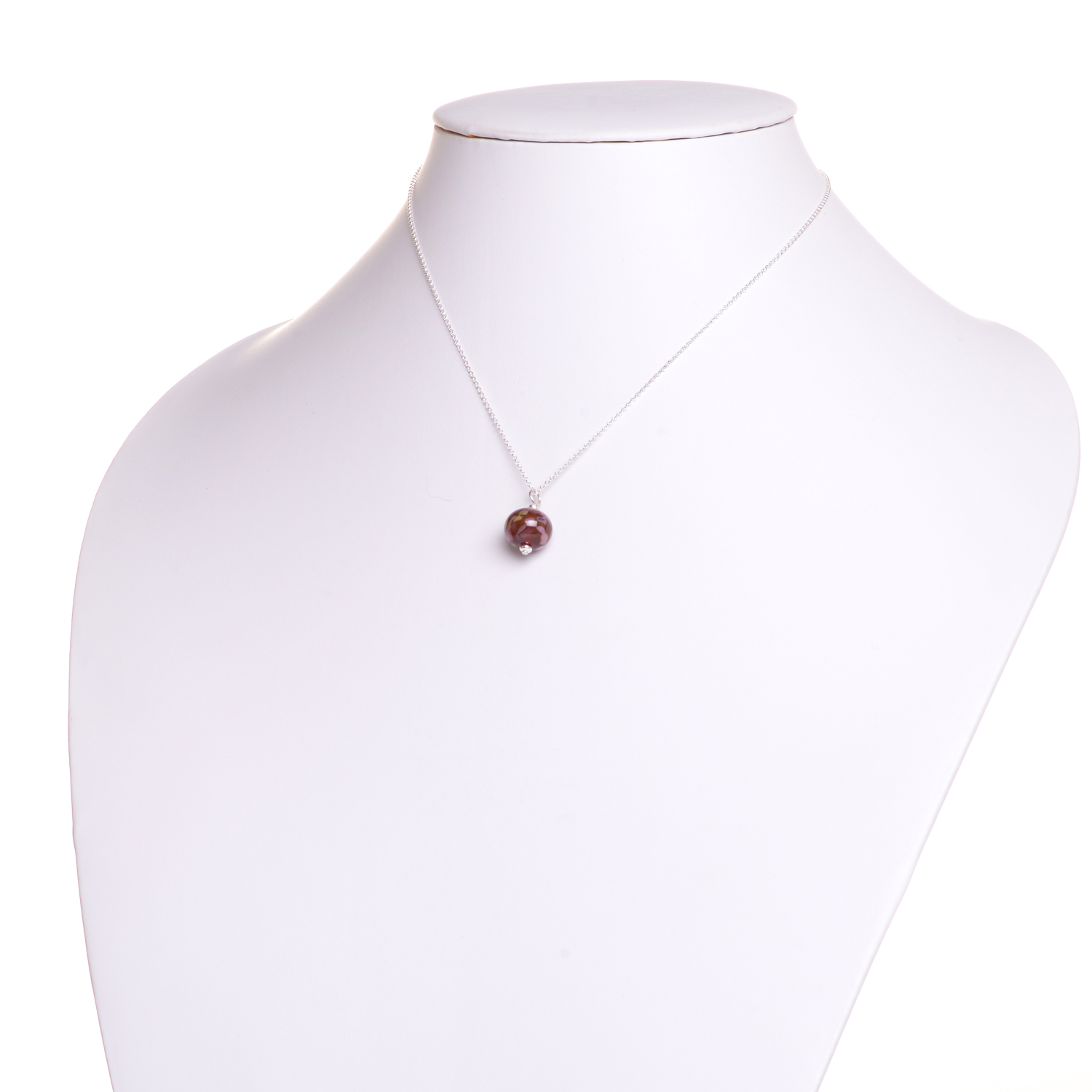 Mini cranberry glass bead pendant created over a torch. Teresa Brittain creates glass beads over a torch, using the centuries-old technique of lampworking, then combines the beads with sterling silver findings and chains to create unique pieces of wearable art.