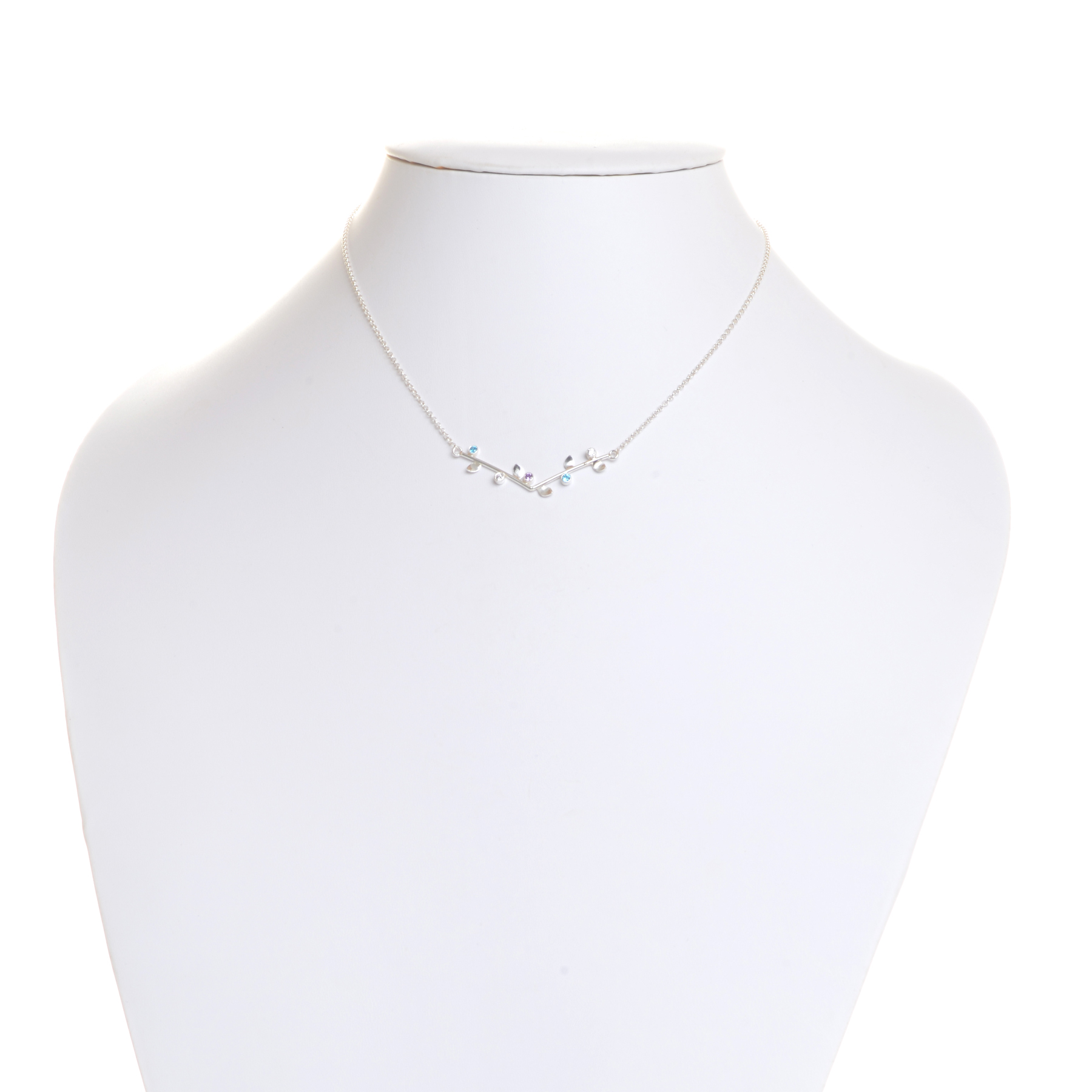 Sterling silver necklace featuring a graceful V-shaped vine, adorned with tiny leaves and sparkling stones, biologically inspired and designed by Charity Hall of Virginia.