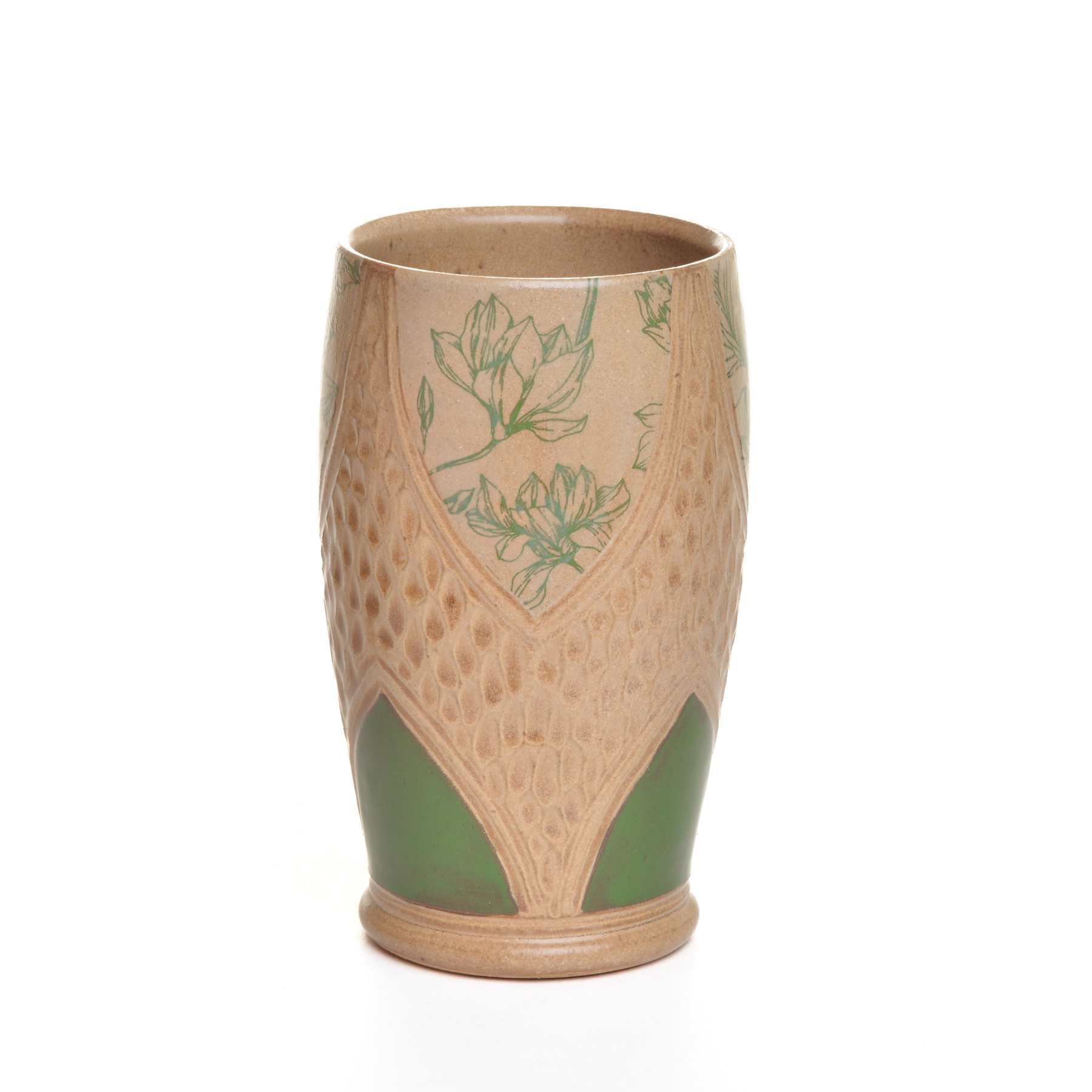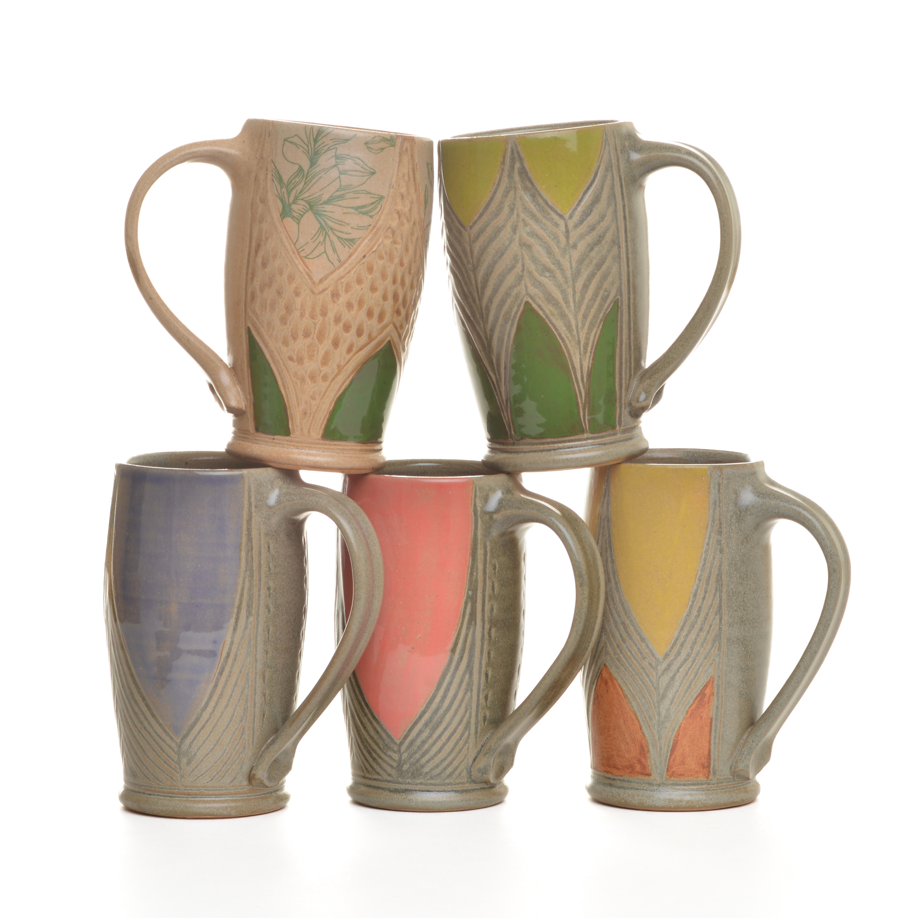 Tall wheel-thrown stoneware mug that combines functional design with intricate botanical artistry by North Carolina potter Robin Kirby Bryant. The original designs are hand-carved and painted on each piece. No two are alike, though they will share the feeling of belonging together. Dishwasher and microwave-safe. Different colors and designs available. Each sold separately.
