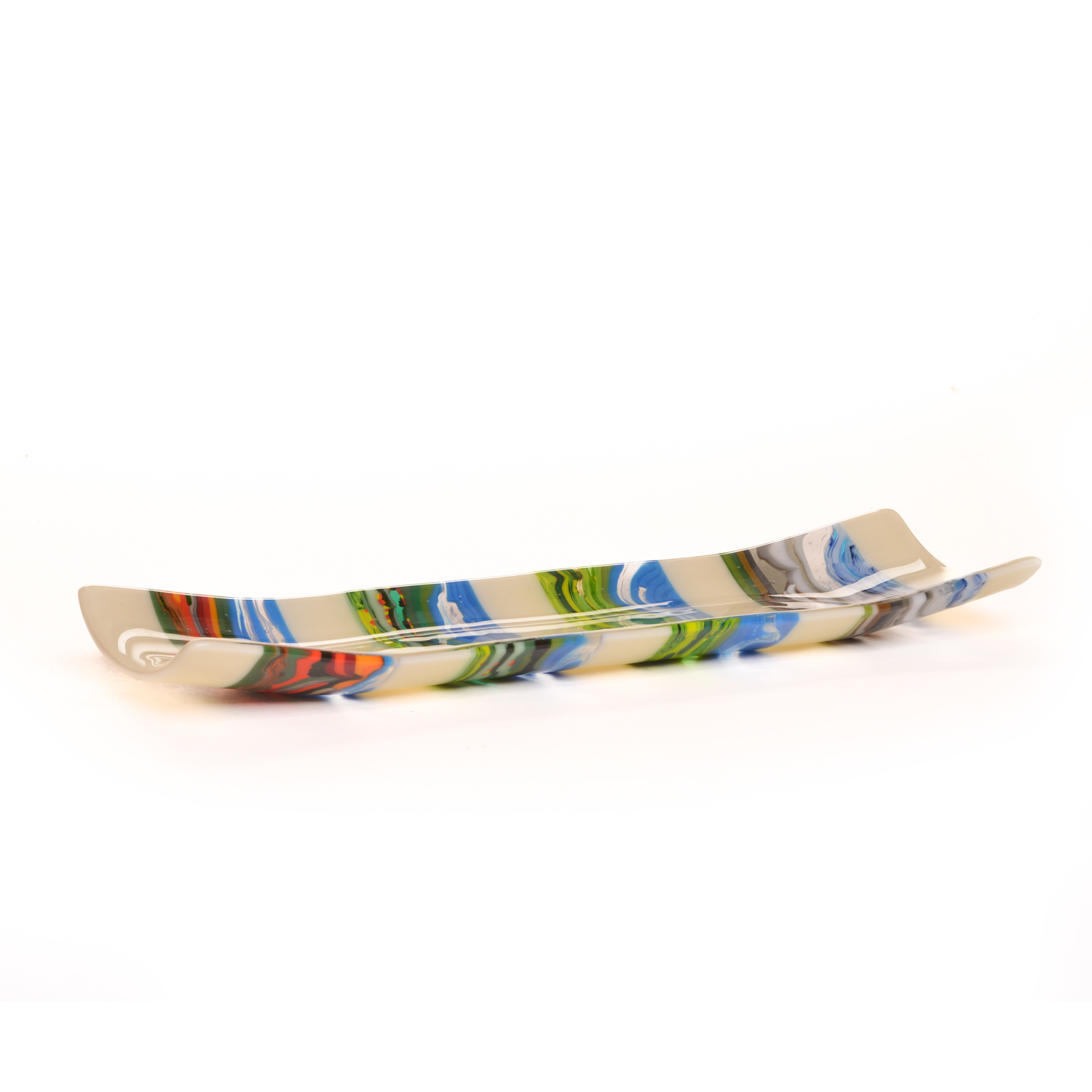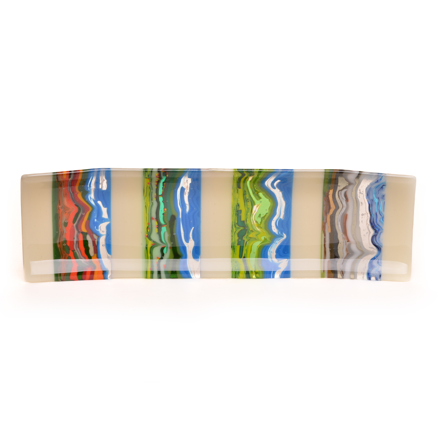Starting with an extensive palette of sheet glass, artists JJ Brown and Simona Rosasco begin by creating kilncast “pattern bars”. Pattern bars are built by stacking or laying vibrant, multihued glass into molds made of high temperature materials. These molds are then fired in a kiln, at temperatures approaching 1600 degrees, creating solid glass bars of interesting and unusual design. Slices of these bars, cut with a wet diamond saw, become “parts” which are included in the designs of flat panels and fired again creating the unique, intricate patterns found within their work. The final piece is a colorful flat panel.