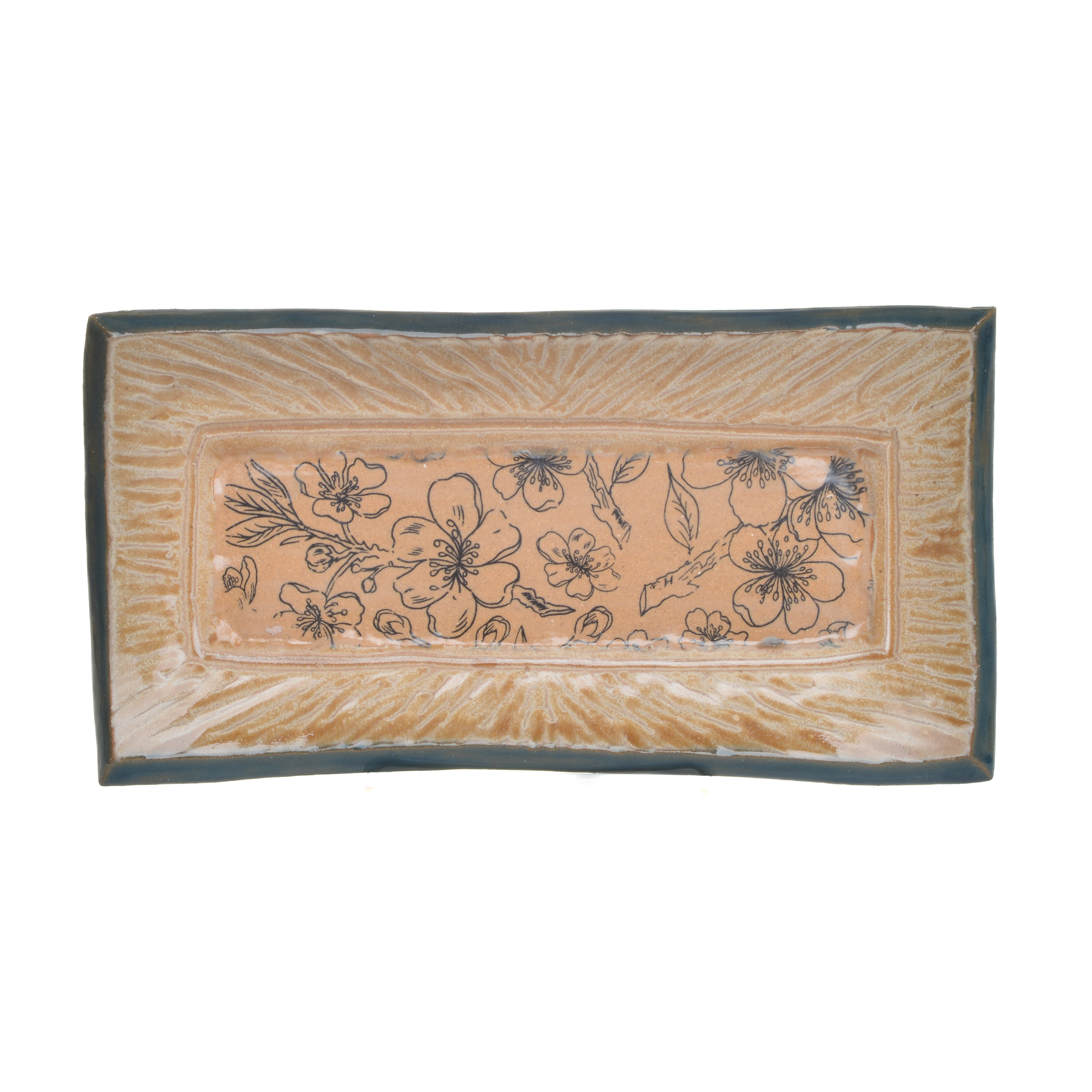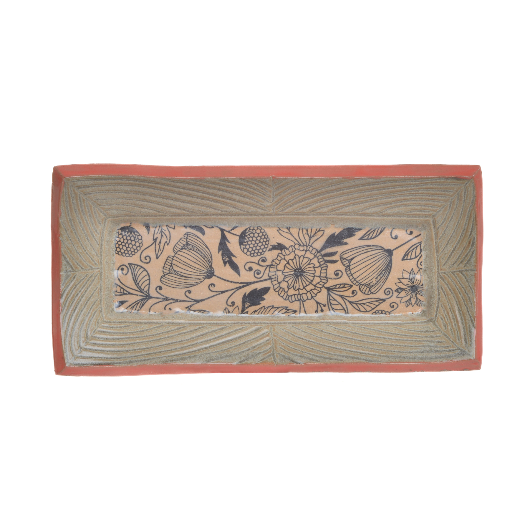 Small slab-built stoneware tray that combines functional design with intricate botanical artistry by North Carolina potter Robin Kirby Bryant. The original designs are hand-carved and painted on each piece. No two are alike, though they will share the feeling of belonging together. Dishwasher and microwave-safe. Different colors and designs available. Each sold separately.