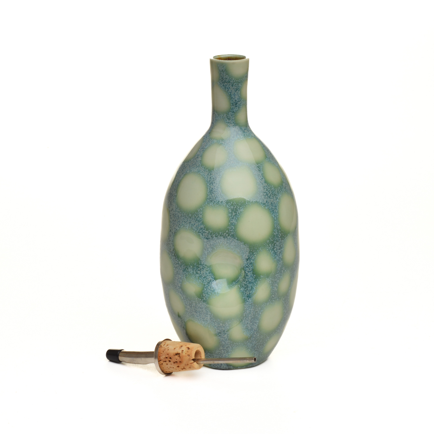 Bright and colorful hand painted polka dot ceramic oil bottle, created on the potter’s wheel. Little dents on opposite sides make it easy to grip. Expect slight variations.