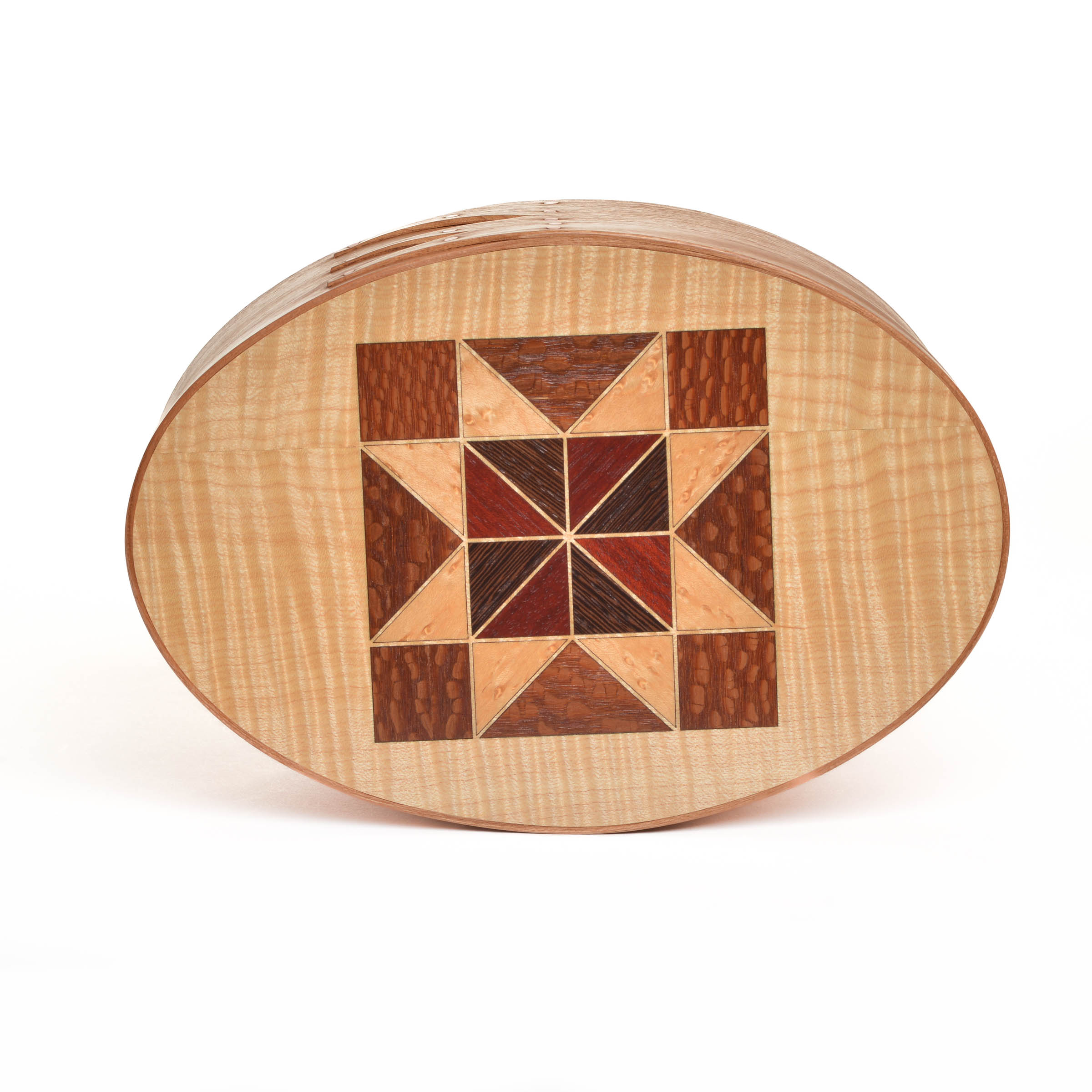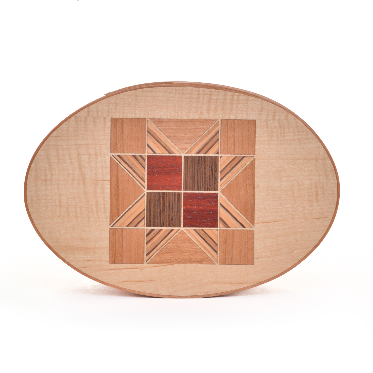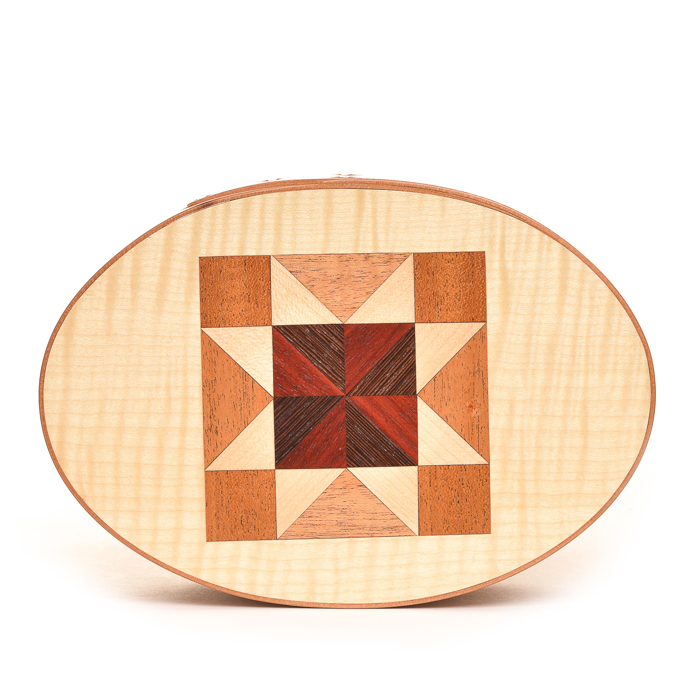 These quilt top boxes marry two traditional American crafts. Inspired by Jeff’s wife, who is a quilter, he began crafting traditional quilt blocks on the tops of many of his shaker boxes using various wood veneers.