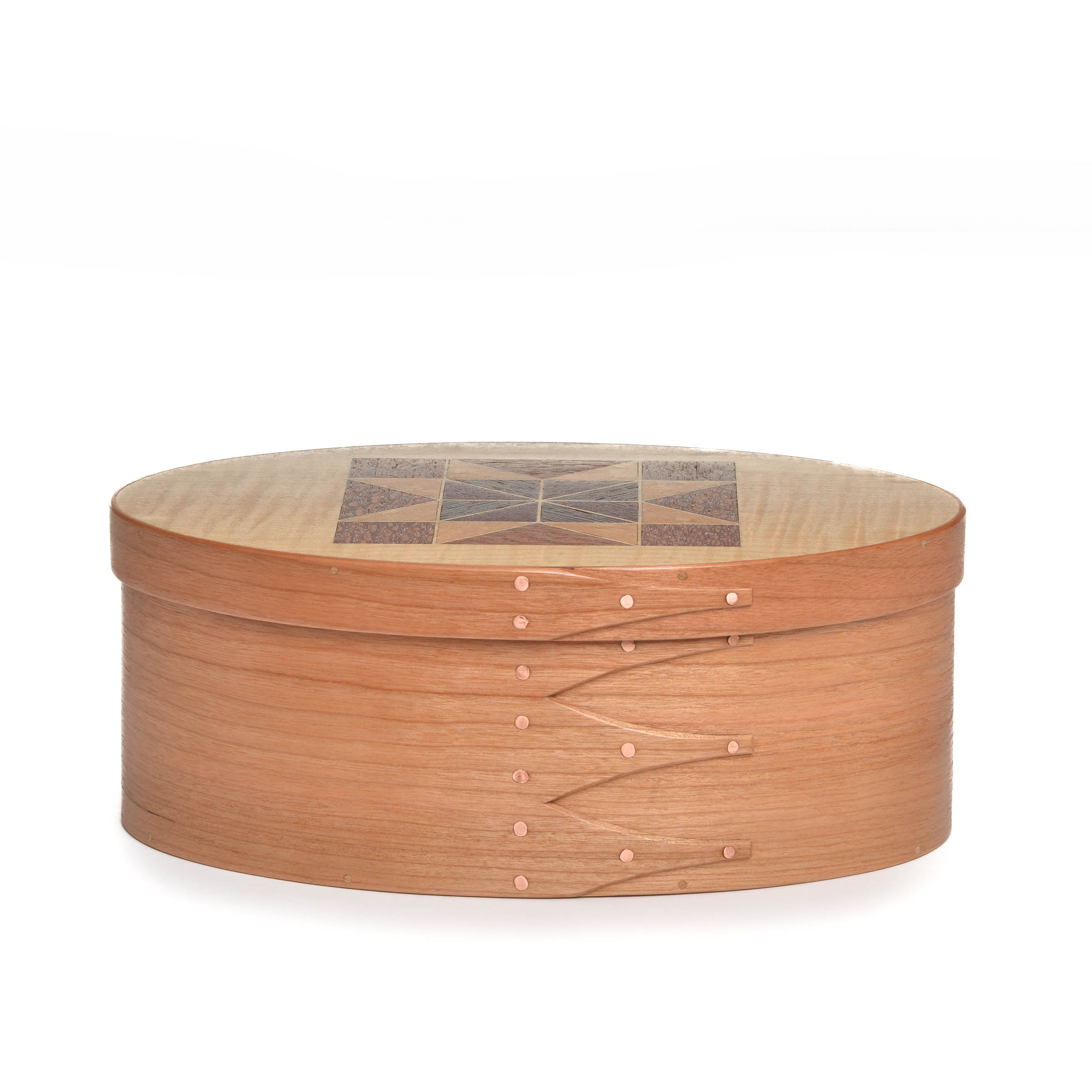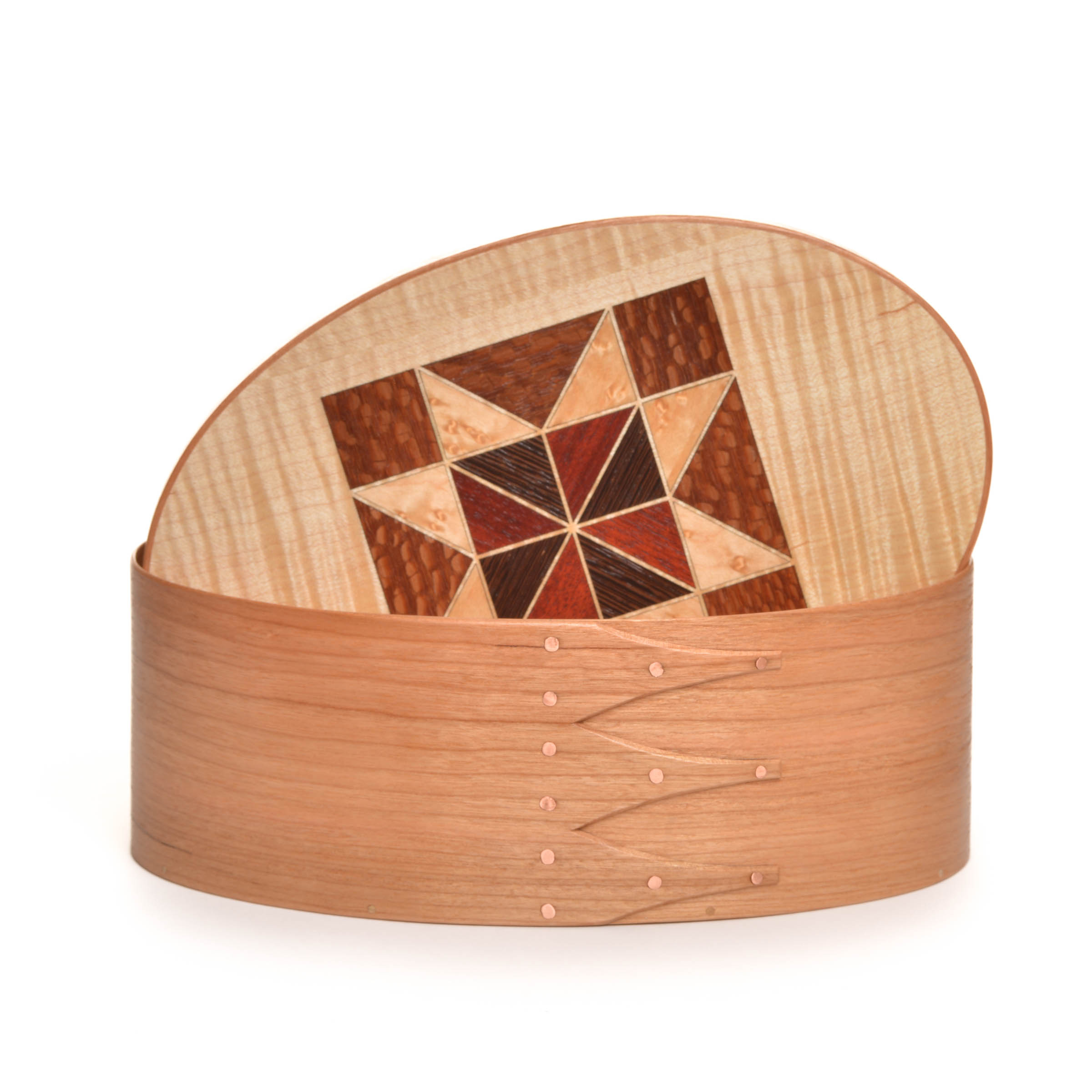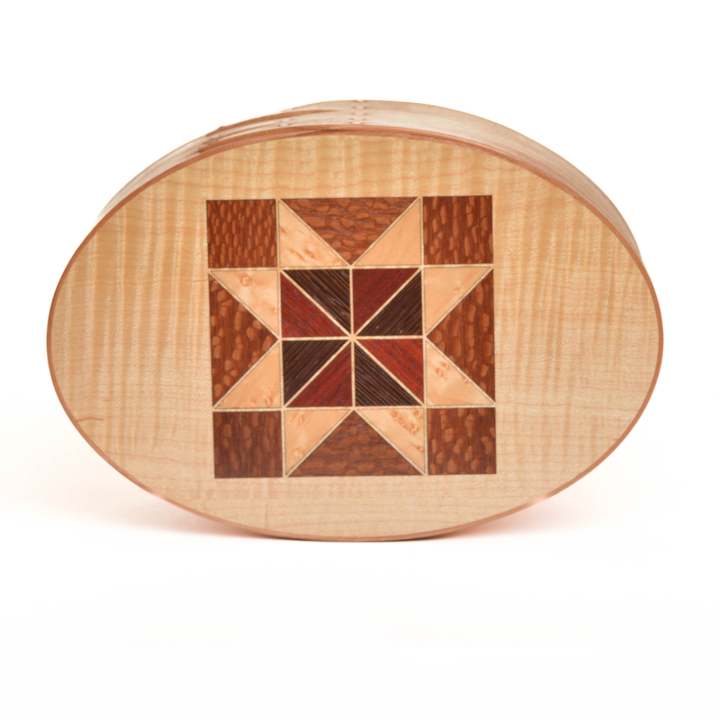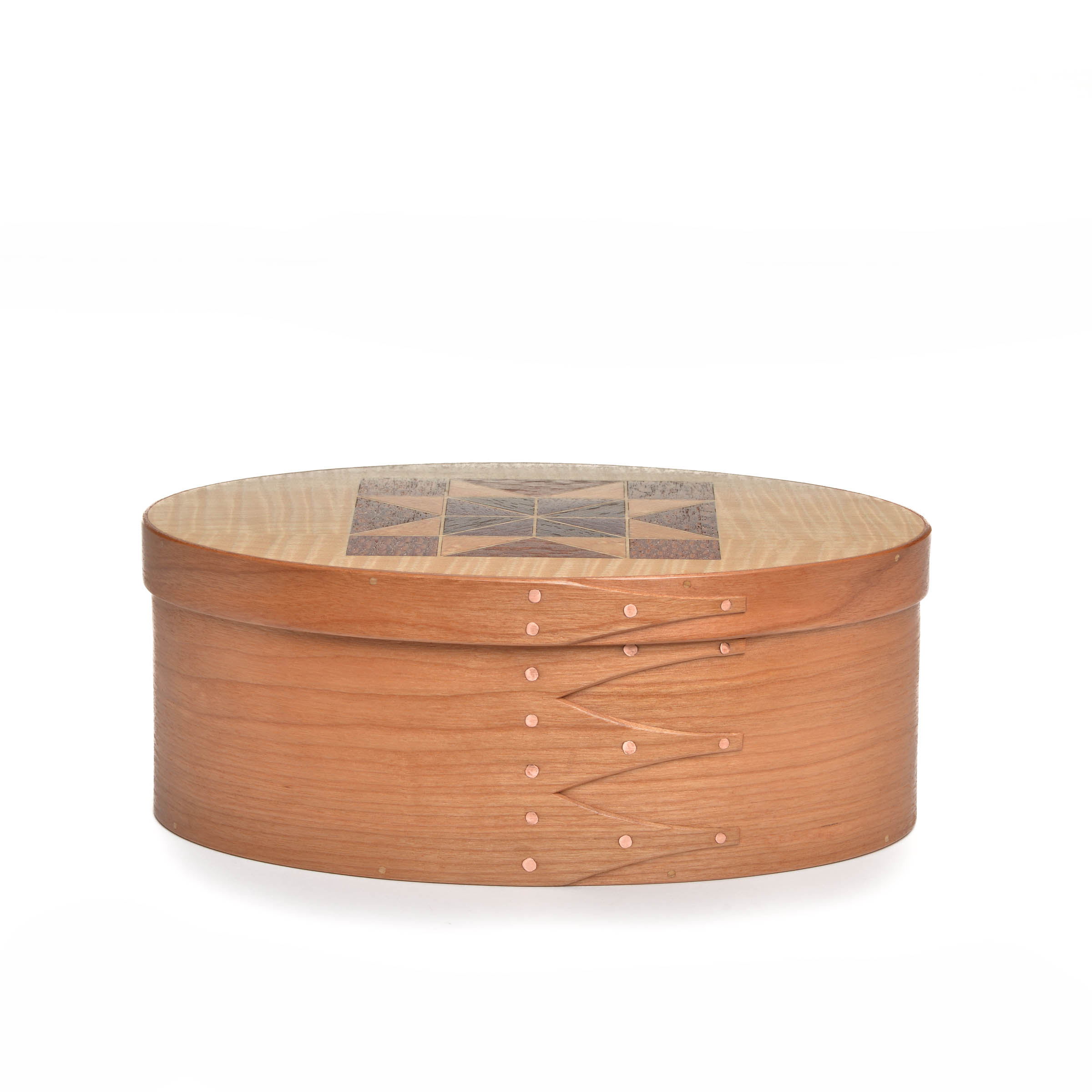 These quilt top boxes marry two traditional American crafts. Inspired by Jeff’s wife, who is a quilter, he began crafting traditional quilt blocks on the tops of many of his shaker boxes using various wood veneers.