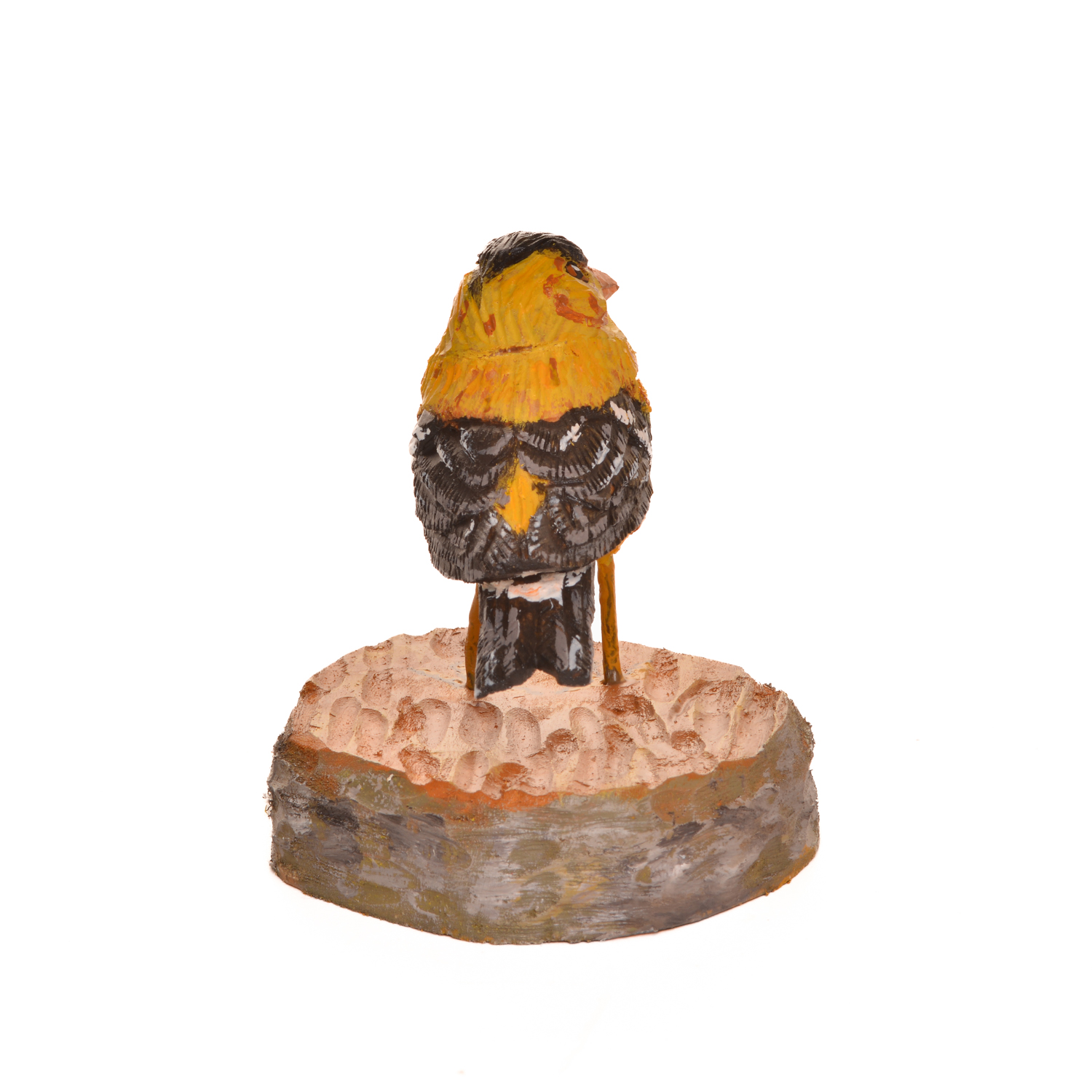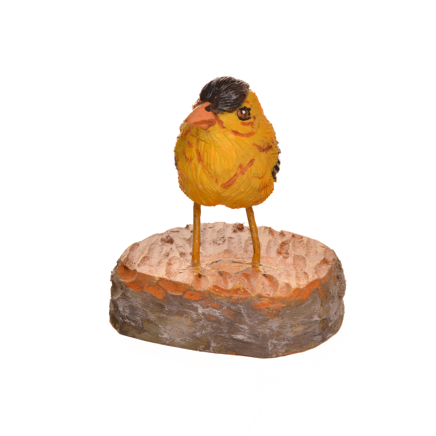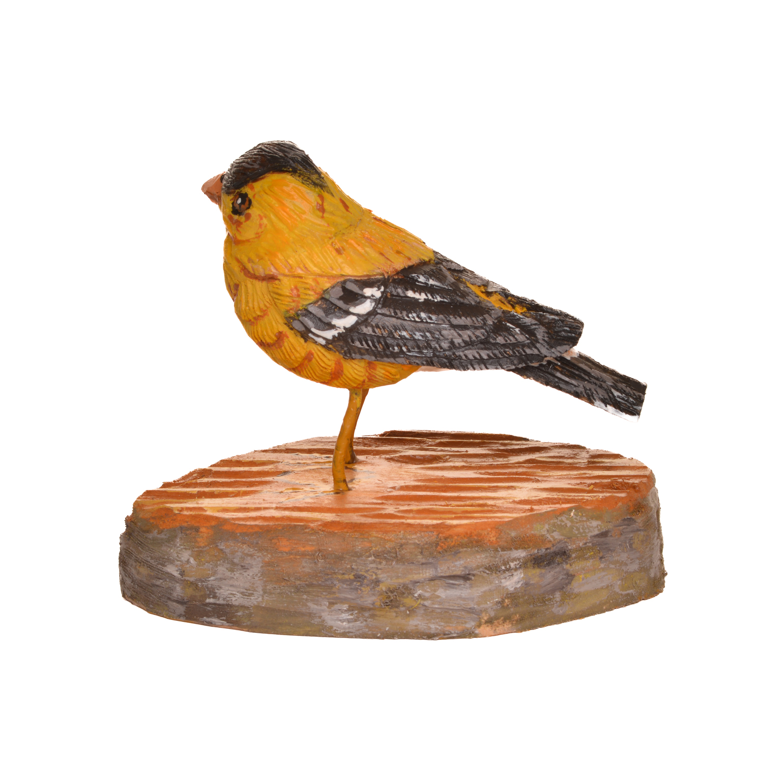 Realistic hand-carved and painted Goldfinch. Masterfully painted and posed. John Dickens carves each piece with an ordinary pocketknife. John has been carving wood for 48 years. John wrote, “each time I do an animal, I want to do it in a different pose so I can learn more about its anatomy and how it moves and behaves.” His primary subjects are the local songbirds found at his backyard bird feeder, animals, fish, people and reliefs.