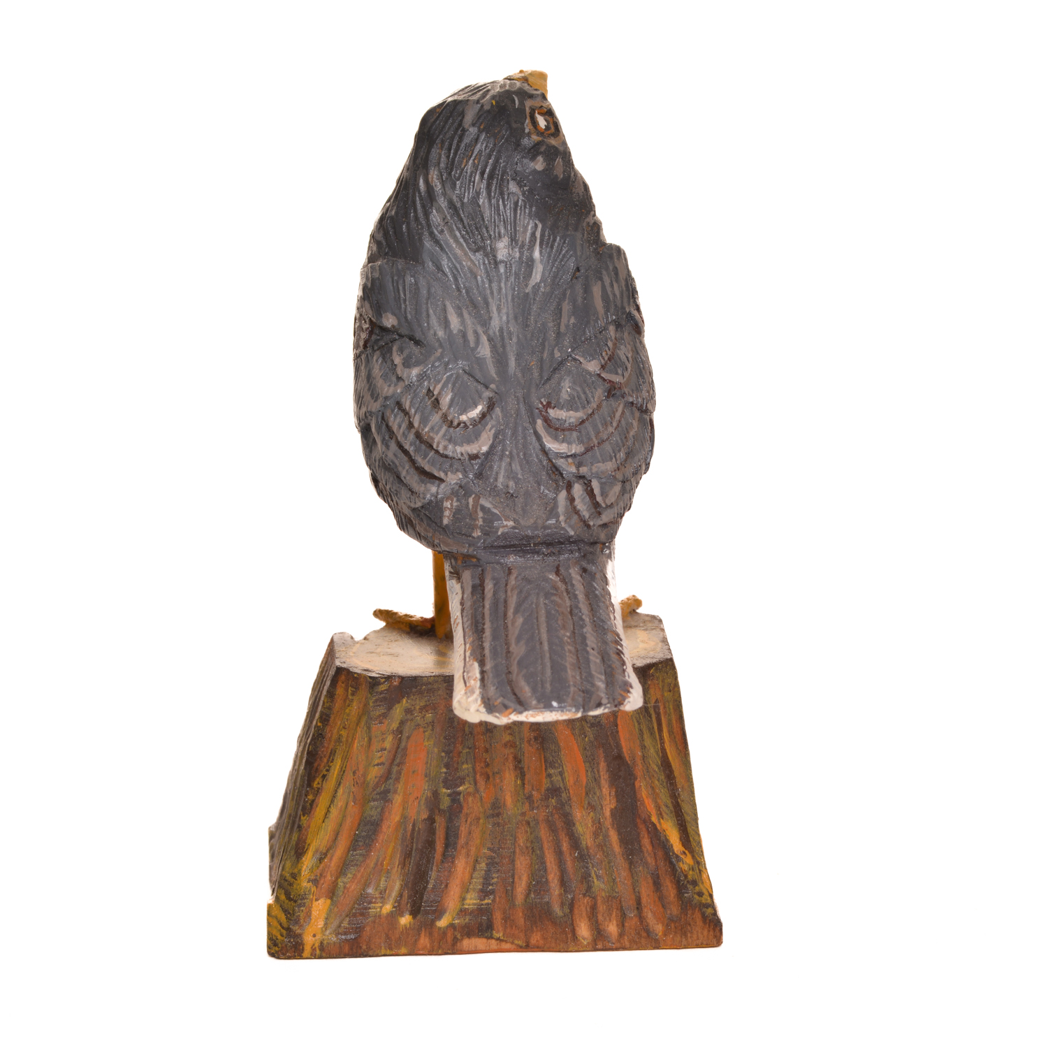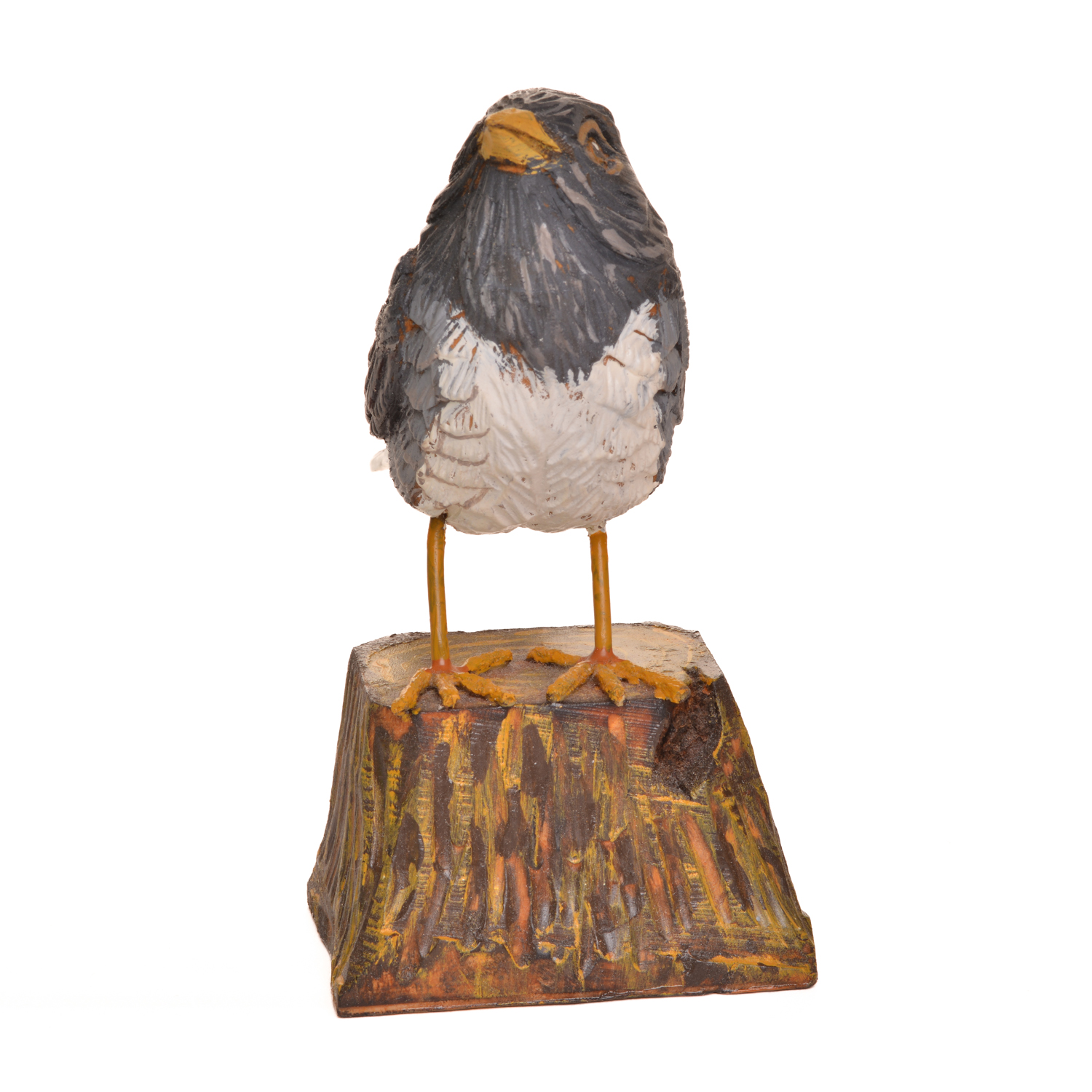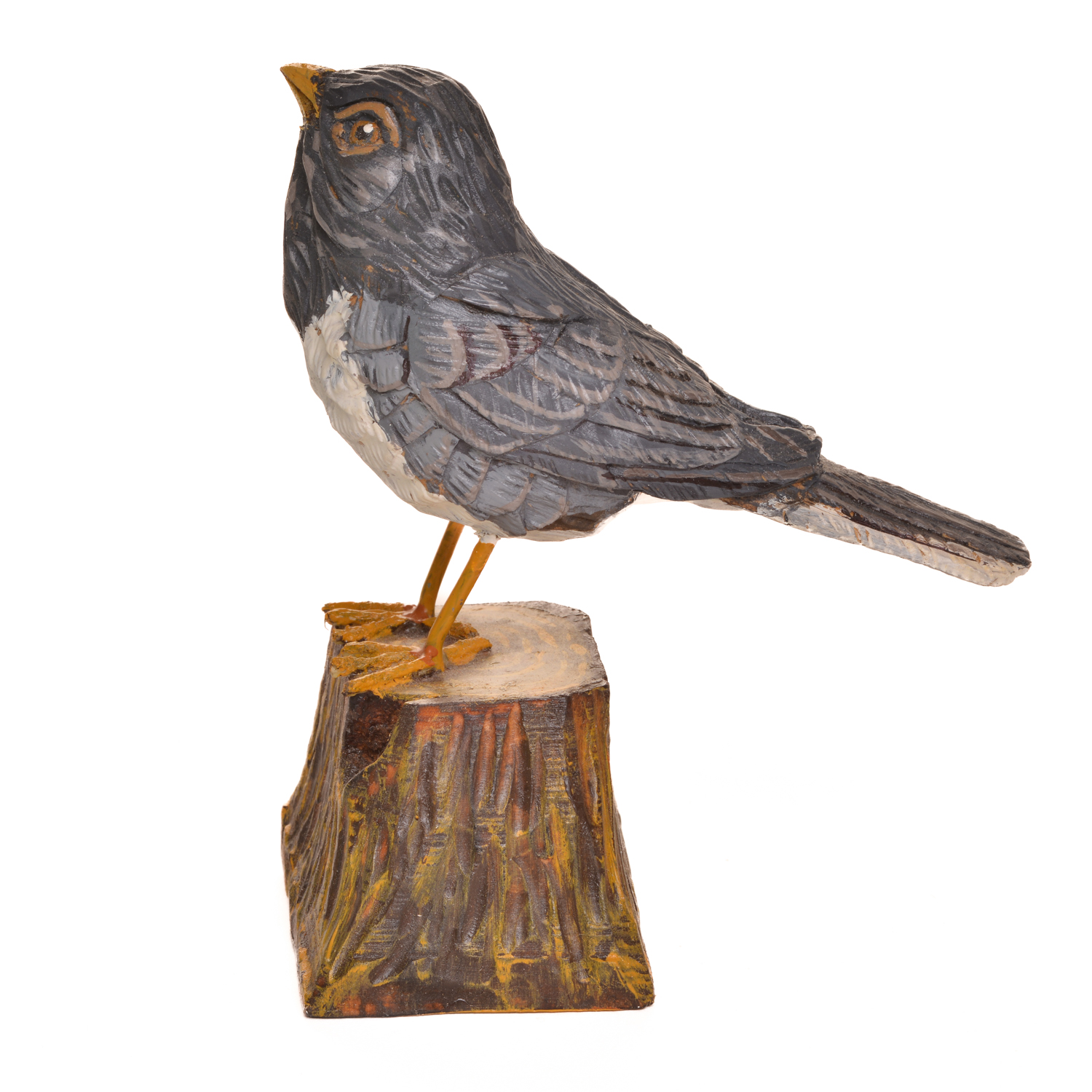 Realistic hand carved and painted Junco. Masterfully painted and posed. John Dickens carves each piece with an ordinary pocketknife. John has been carving wood for 48 years. John wrote, “each time I do an animal, I want to do it in a different pose so I can learn more about its anatomy and how it moves and behaves.” His primary subjects are the local songbirds found at his backyard bird feeder, animals, fish, people and reliefs.