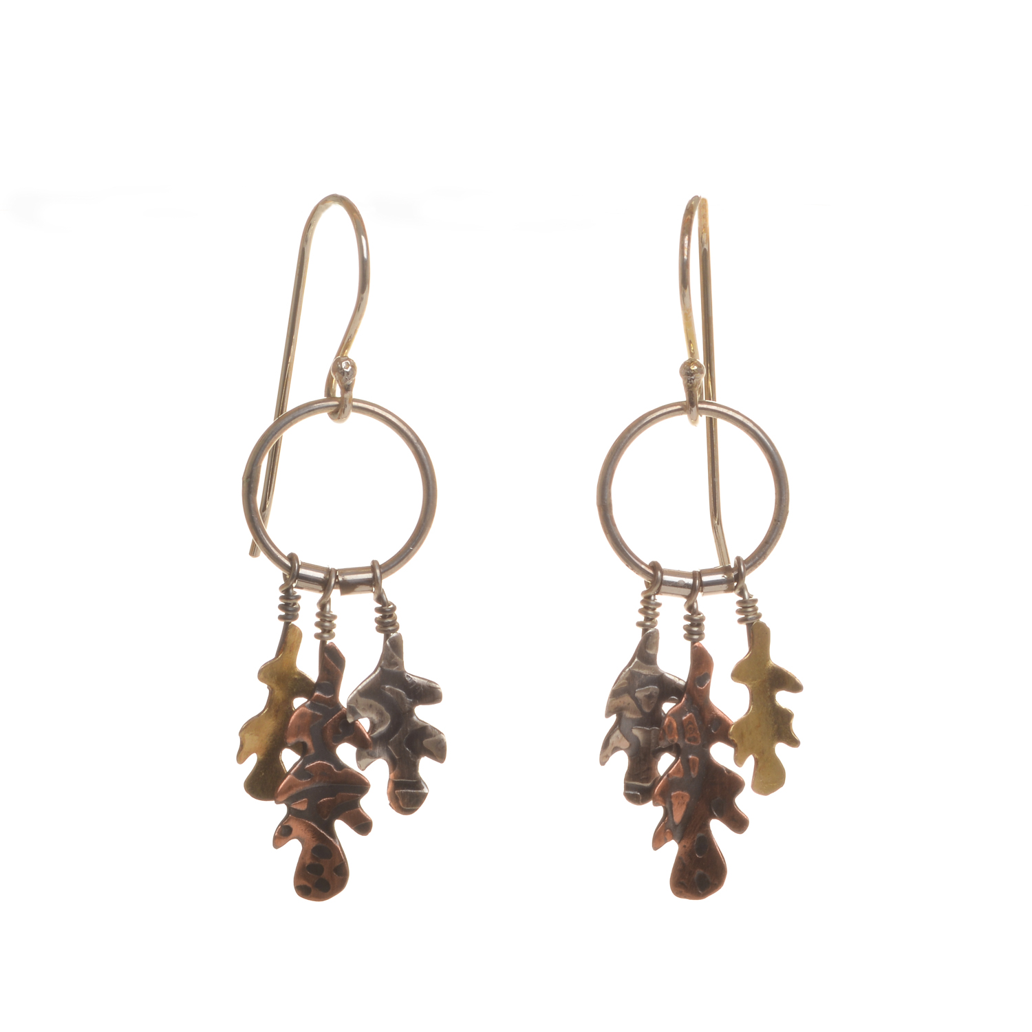 Handcrafted earrings with embossed silver, copper, and brass leaves by silversmith Barbara Joiner of North Carolina. Expect slight variations in leaf design.
