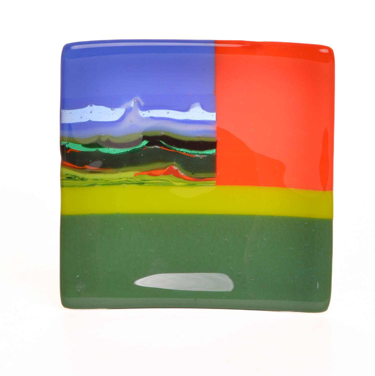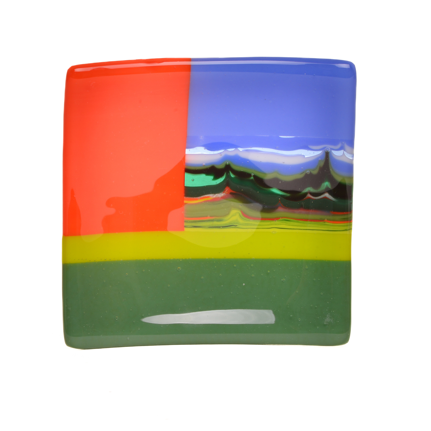 Starting with an extensive palette of sheet glass, artists JJ Brown and Simona Rosasco begin by creating kilncast “pattern bars”. Pattern bars are built by stacking or laying vibrant, multihued glass into molds made of high temperature materials. These molds are then fired in a kiln, at temperatures approaching 1600 degrees, creating solid glass bars of interesting and unusual design. Slices of these bars, cut with a wet diamond saw, become “parts” which are included in the designs of flat panels and fired again creating the unique, intricate patterns found within their work. The final piece is a colorful flat panel.