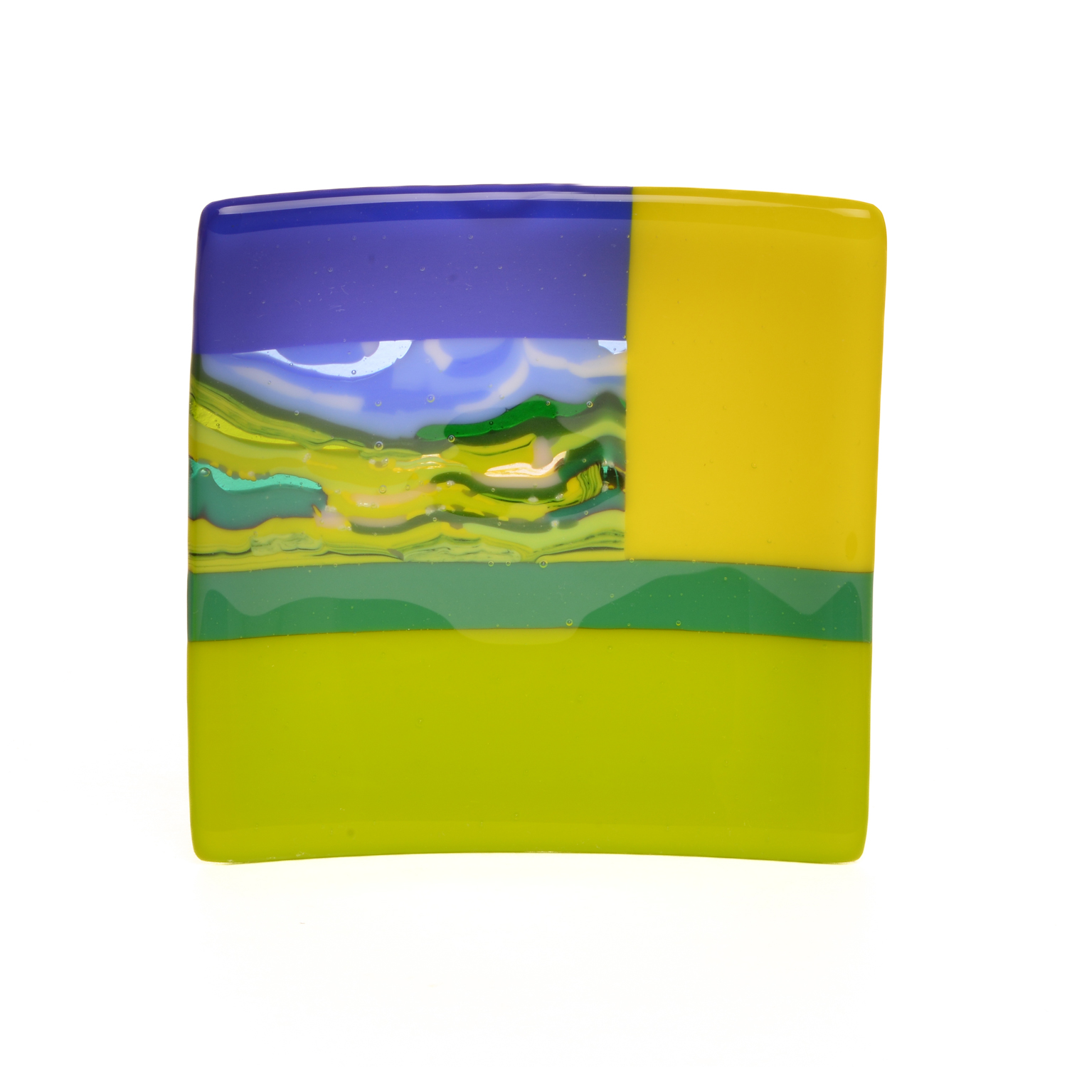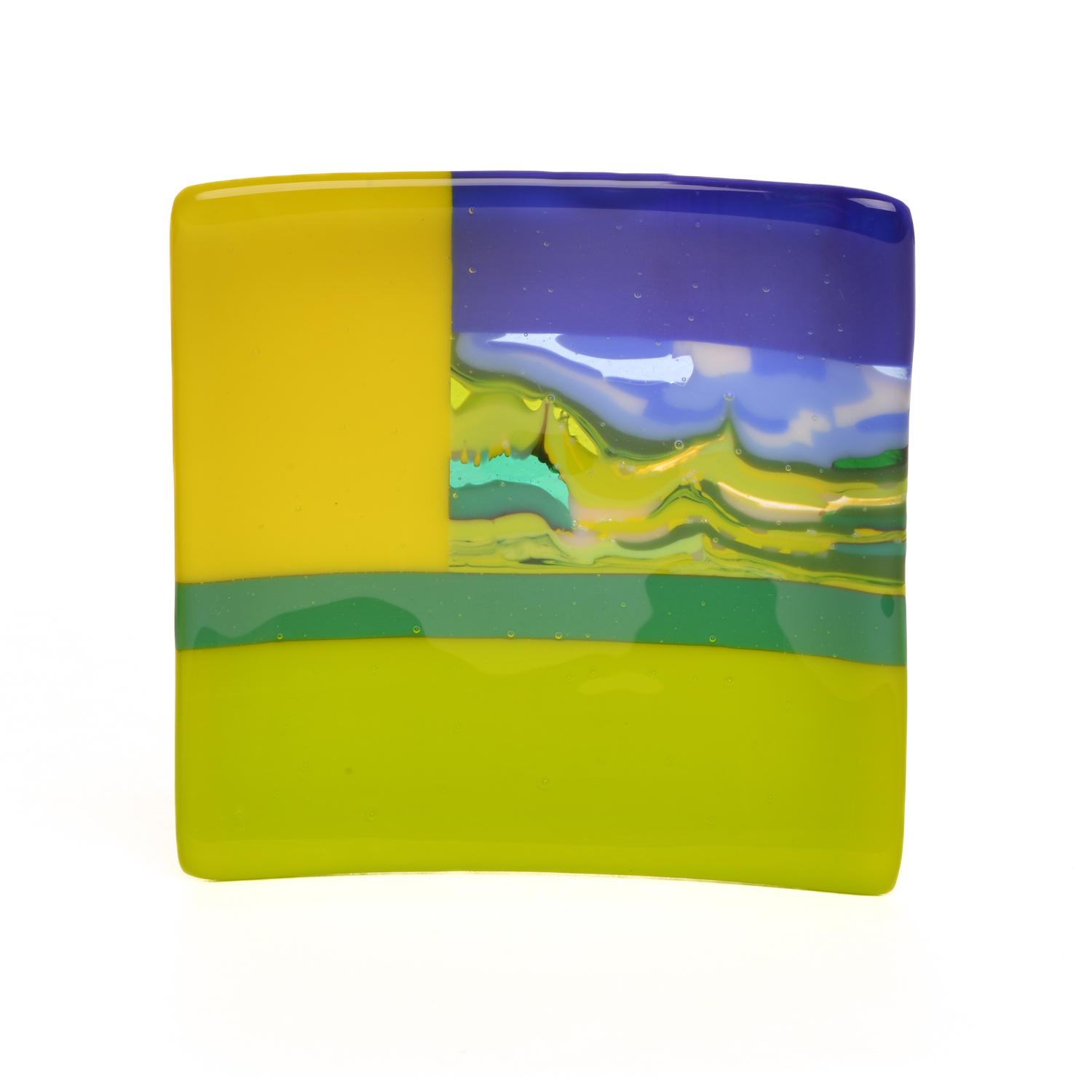 Starting with an extensive palette of sheet glass, artists JJ Brown and Simona Rosasco begin by creating kilncast “pattern bars”. Pattern bars are built by stacking or laying vibrant, multihued glass into molds made of high temperature materials. These molds are then fired in a kiln, at temperatures approaching 1600 degrees, creating solid glass bars of interesting and unusual design. Slices of these bars, cut with a wet diamond saw, become “parts” which are included in the designs of flat panels and fired again creating the unique, intricate patterns found within their work. The final piece is a colorful flat panel.