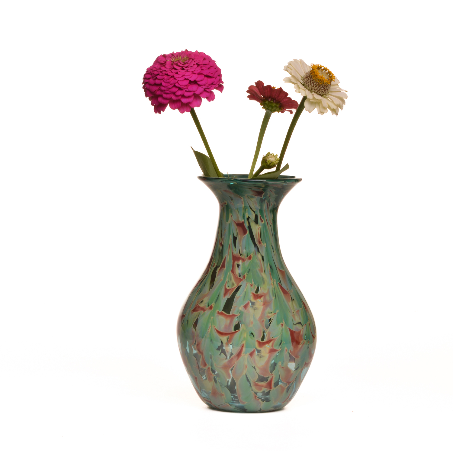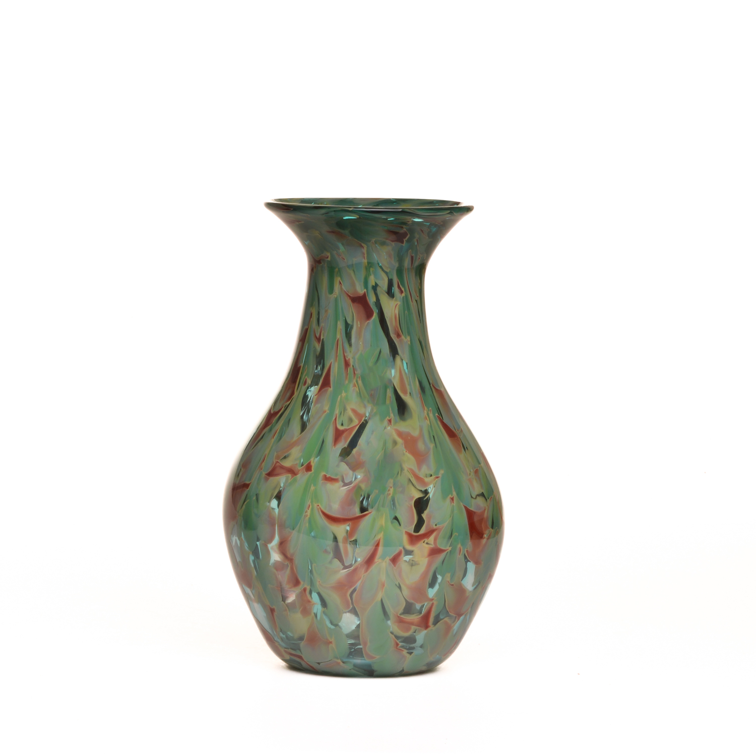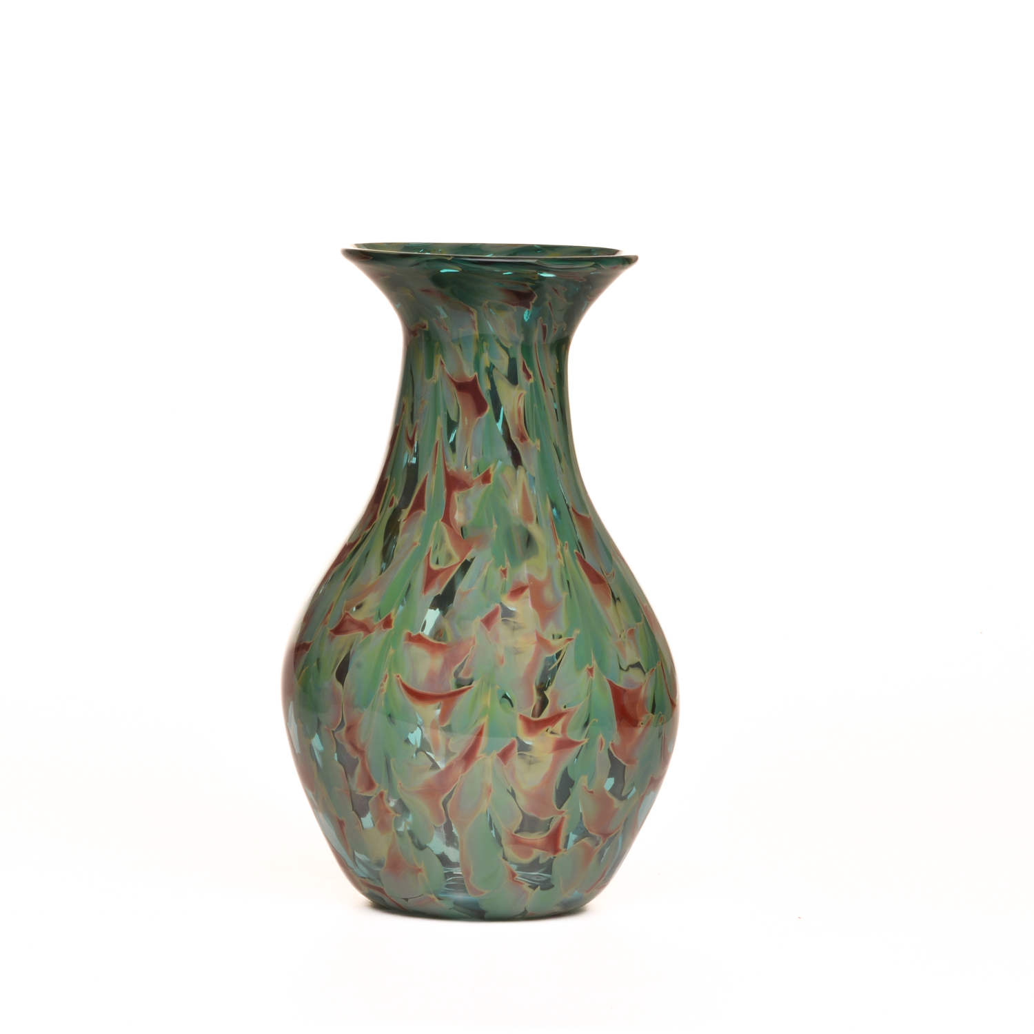 Shades of greens, blues, and reddish-browns flow and form together to create this Lagoon inspired handblown glass vase by Michael Hatch of North Carolina. This piece is perfect for fresh cut flowers or a dried arrangement. Each sold separately.