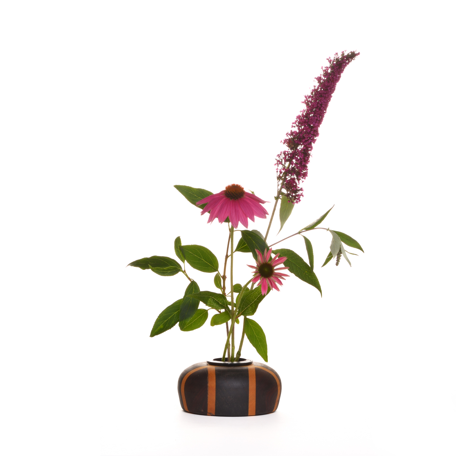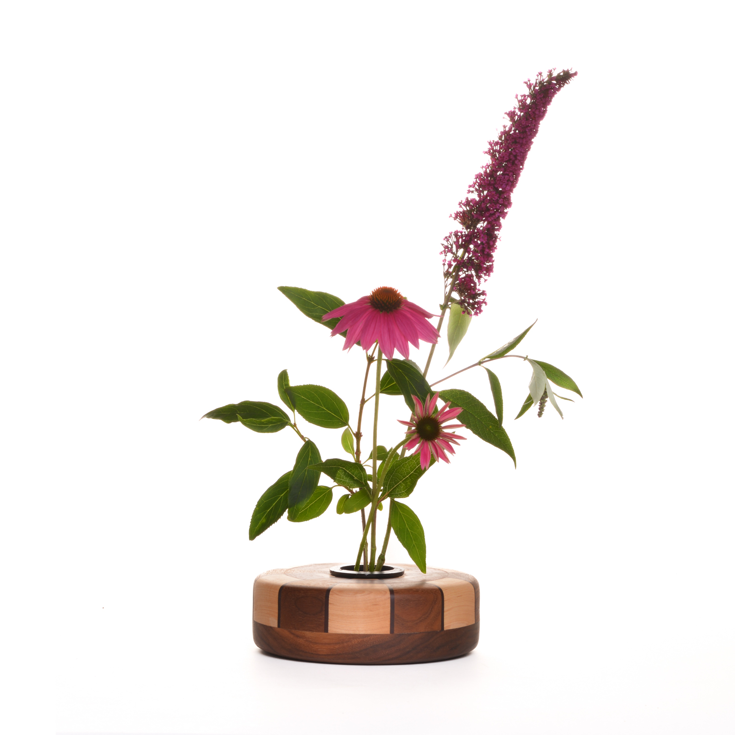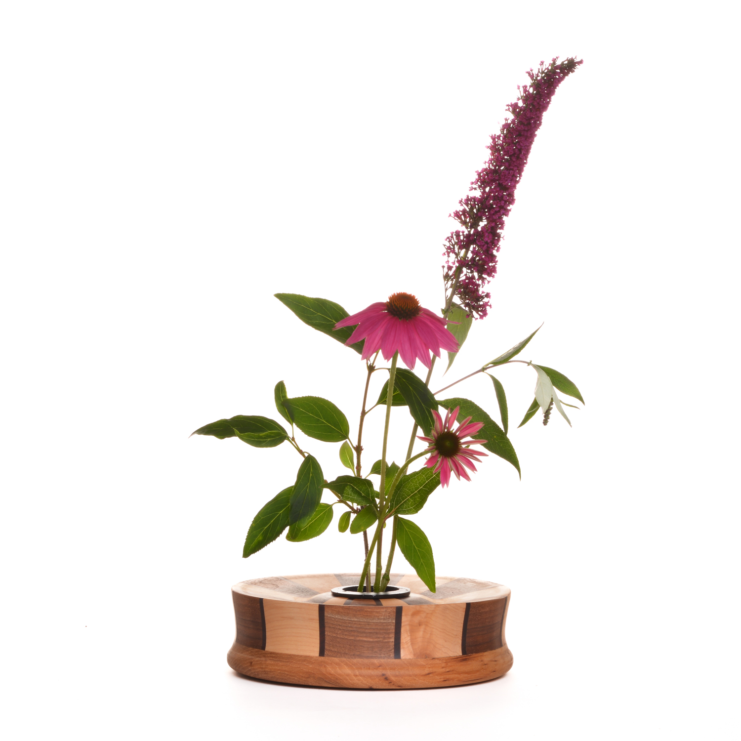 Segmented wooden ikebana vase. The insert is of weighted metal which contains multiple spikes to allow you to place fresh cut flowers inside. This insert can be removed with the flowers and placed in the fridge overnight. This allows for an extended life and fresh appearance for several days. The insert is sealed and allows you to be able to put water inside to help fuel the life of the flowers.