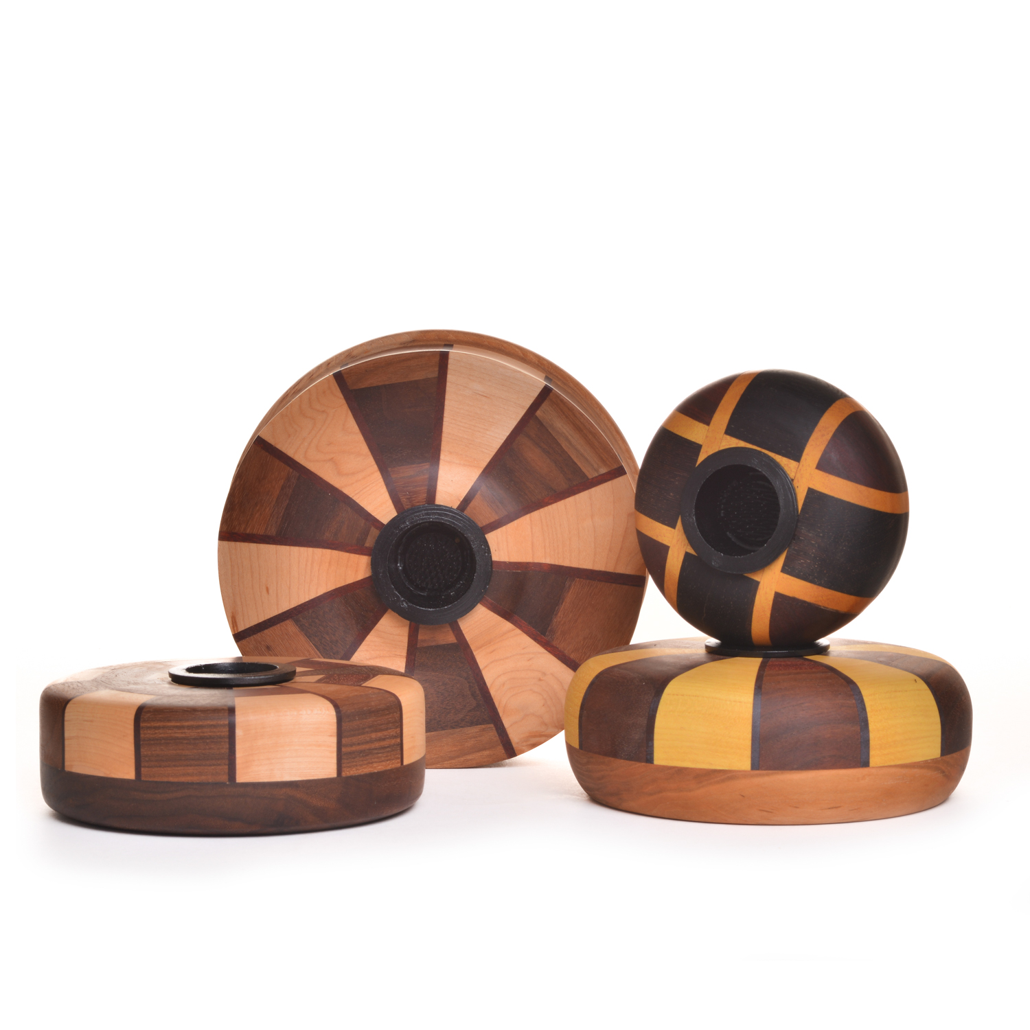 Now known for his focus on “polychromatic segmented woodturning,” Allen Davis’ latest series involves the use of native hardwoods, (cut from his own 10-acre NC hardwood rain forest) layered alternately with imported exotic hardwoods. He has harvested Black Walnut, Cherry, and Oak, from the woods lying along Winchester Creek. New raw materials come from a fellow woodworker, a countertop laminator, who often donates a mysterious collection of exotic wood dropcuts from his waste bin. These exotics often include Cocobolo, Brazilian Cherry, Zebrawood, Marblewood, Yellowheart, Purpleheart, Bloodwood, Ebony, Pink Ivory, or Snakewood. (His friend had always paid a waste management company to haul these away for burning!) Each unique vessel pieced from precision-cut segments reflects his evolving style with new color, pattern, and textural variety.