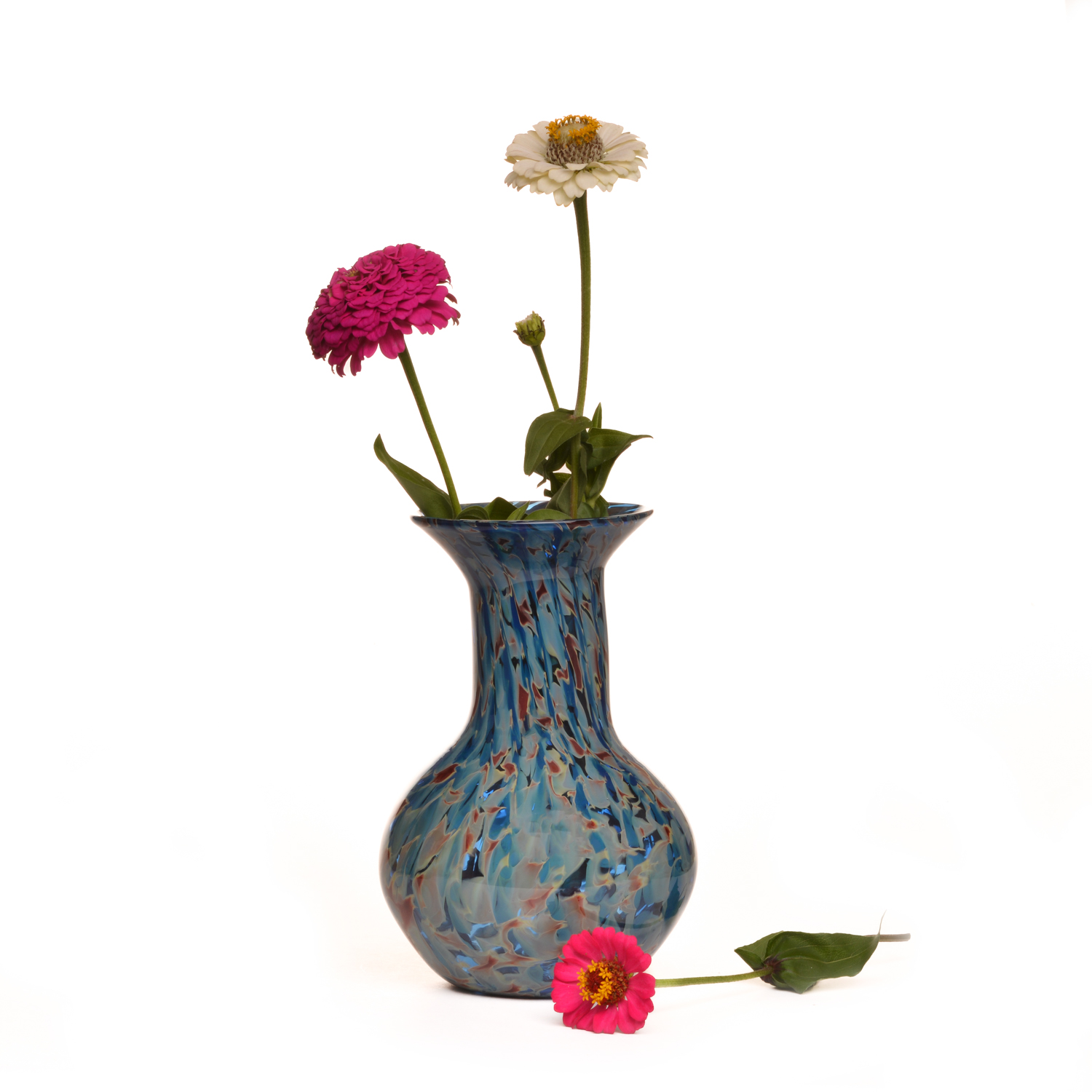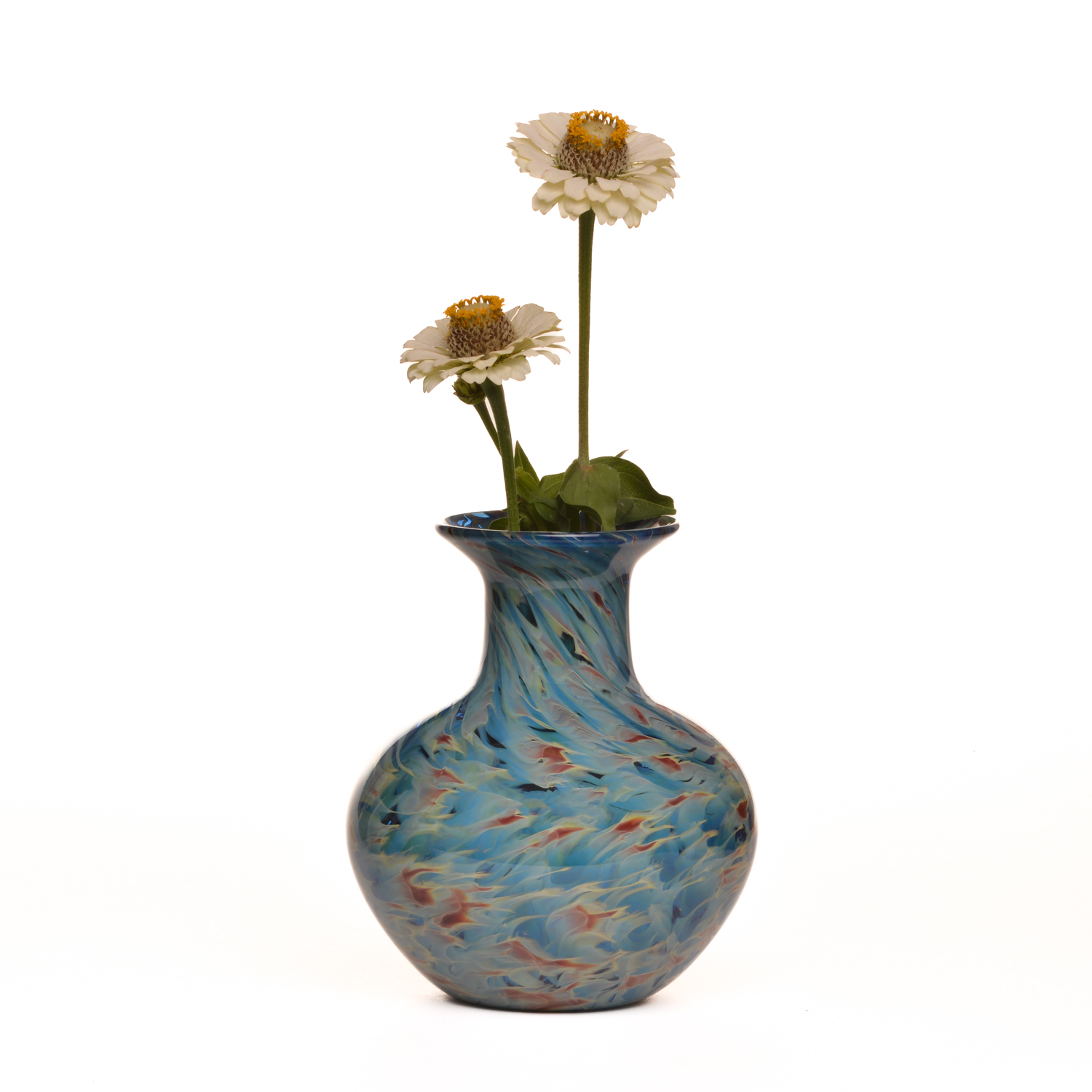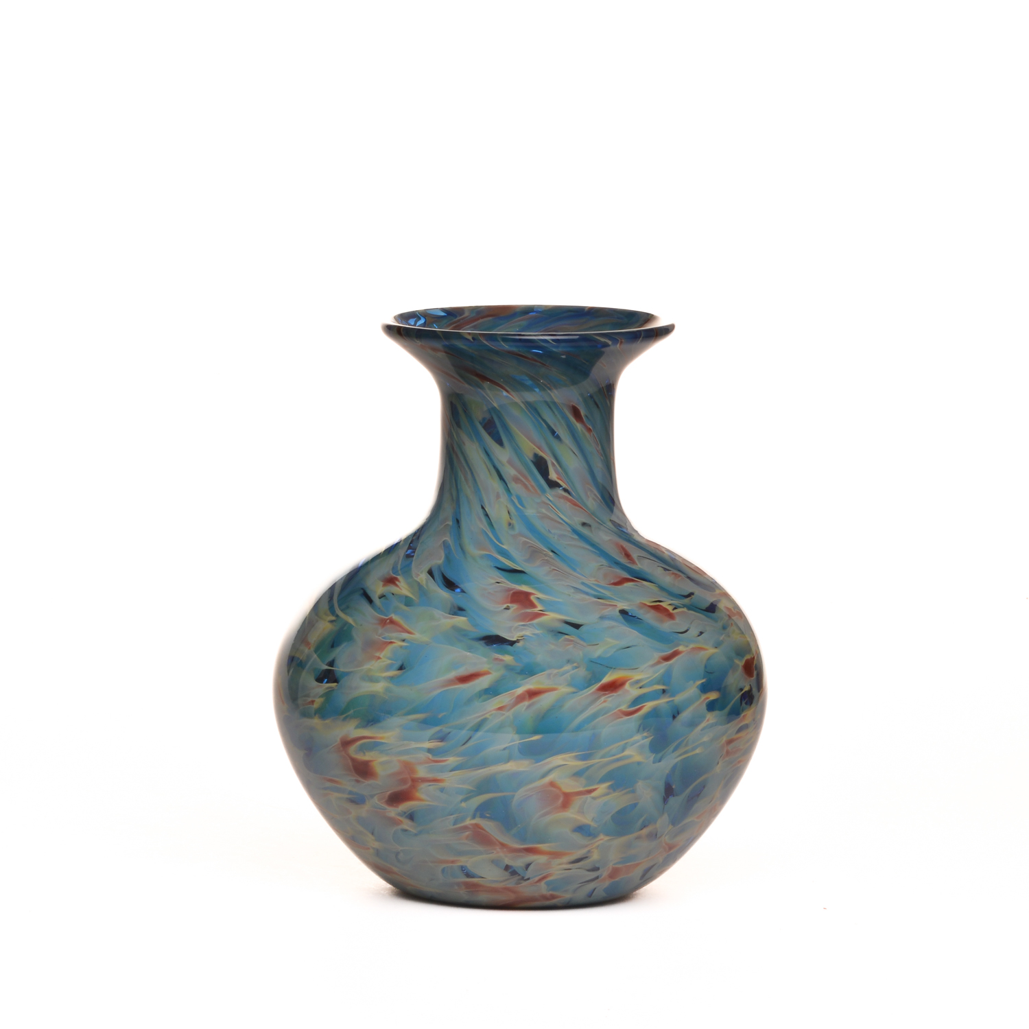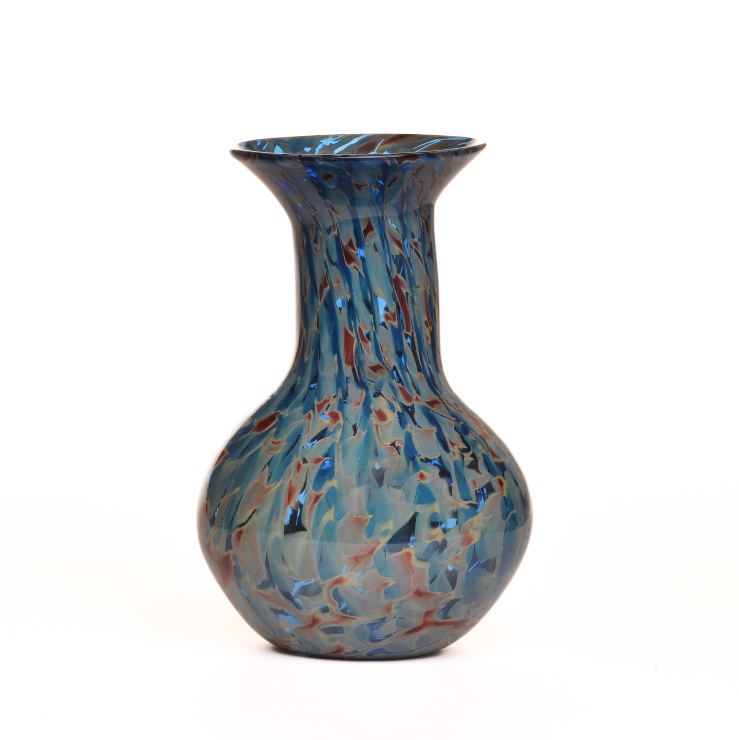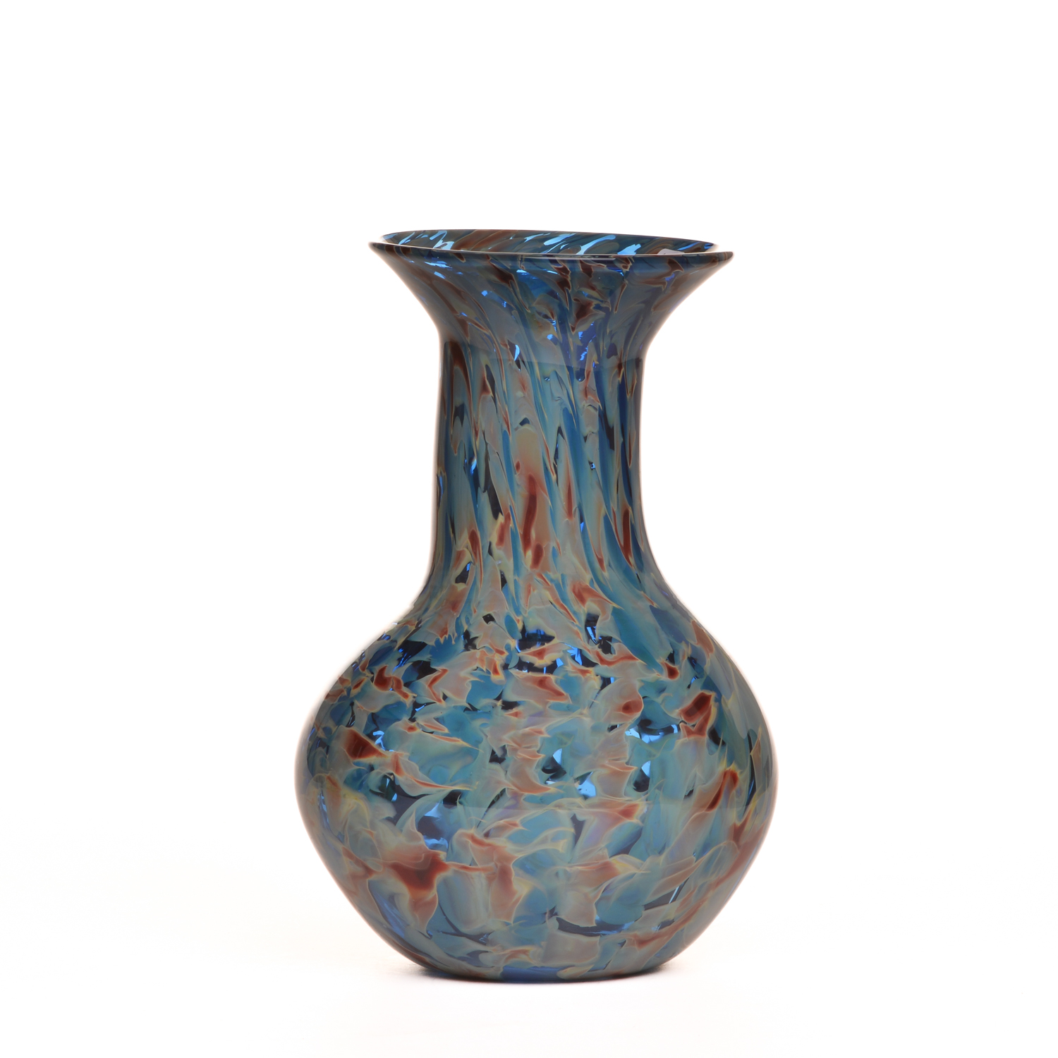 Vibrant blues and browns are swirled and speckled together to create this classic blown glass vase by Michael Hatch of North Carolina. The warm and cool colors of the glass elegantly complement each other, adding the perfect touch to any space in your home. This piece is perfect for fresh cut flowers or a dried arrangement.