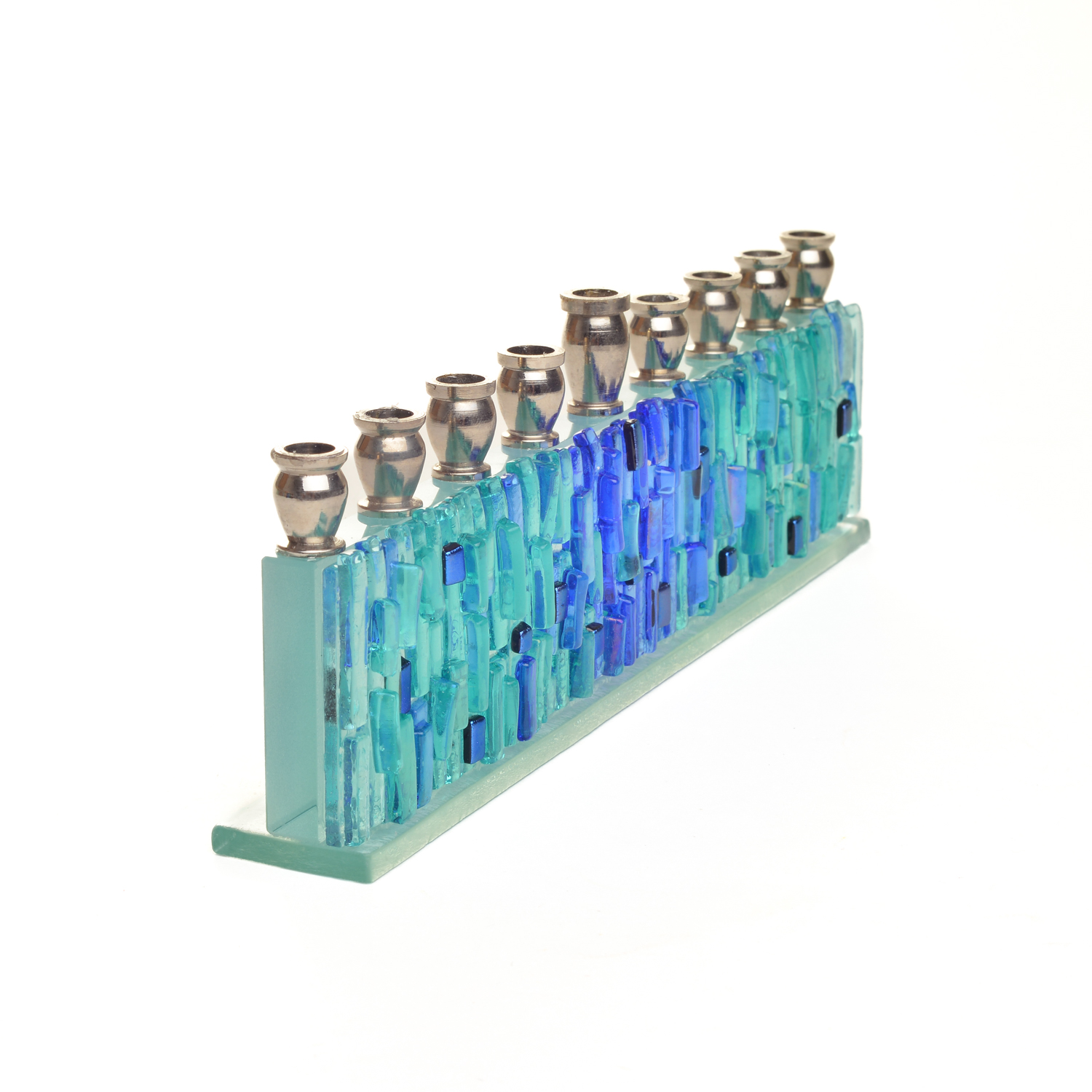 Menorah fused in blue and aqua-toned textured glass, with dichroic speckles. Artist Alicia Kelemen fuses the colorful glass together, then laminates it to a glass surface in a light greenish tone, and adds silver metal tops.