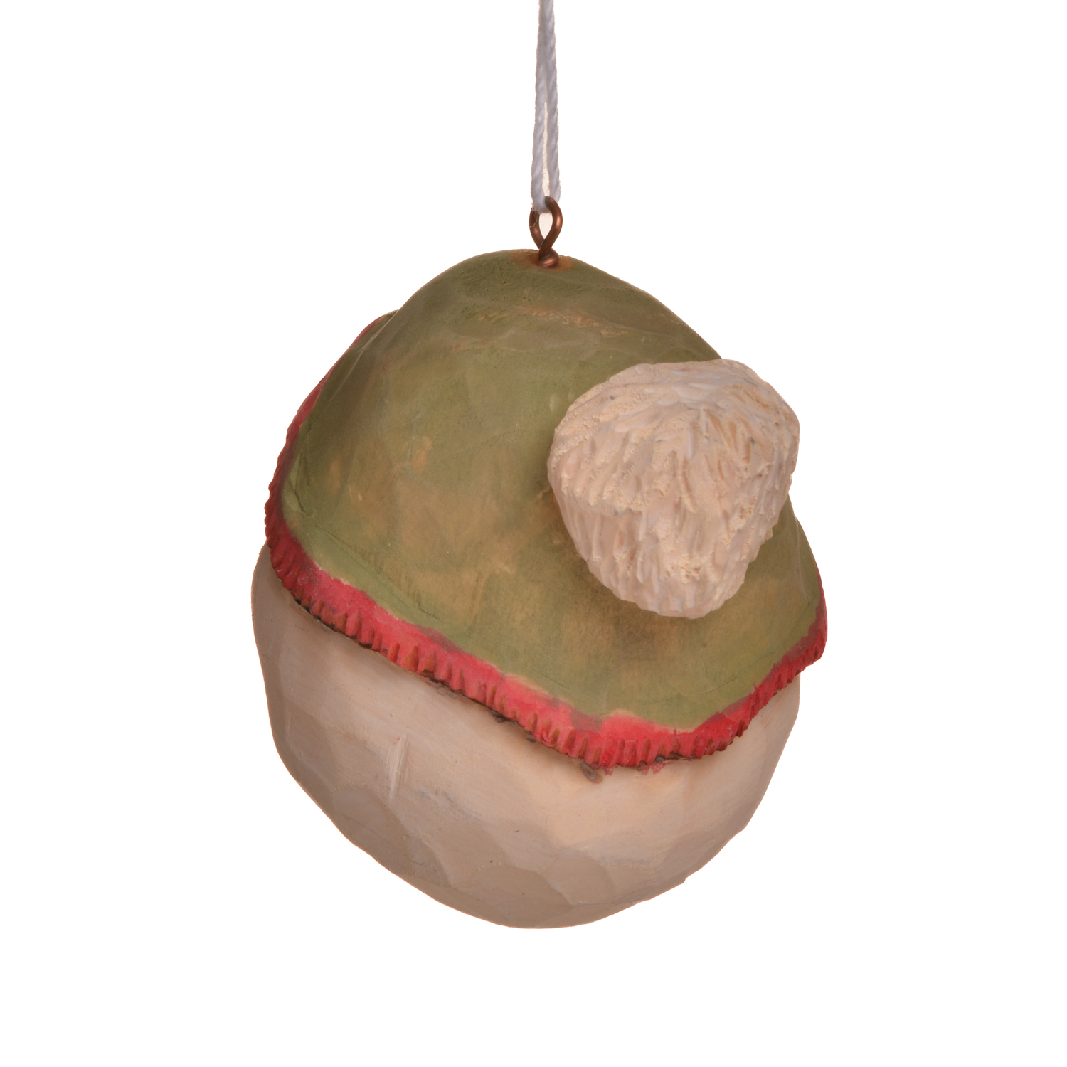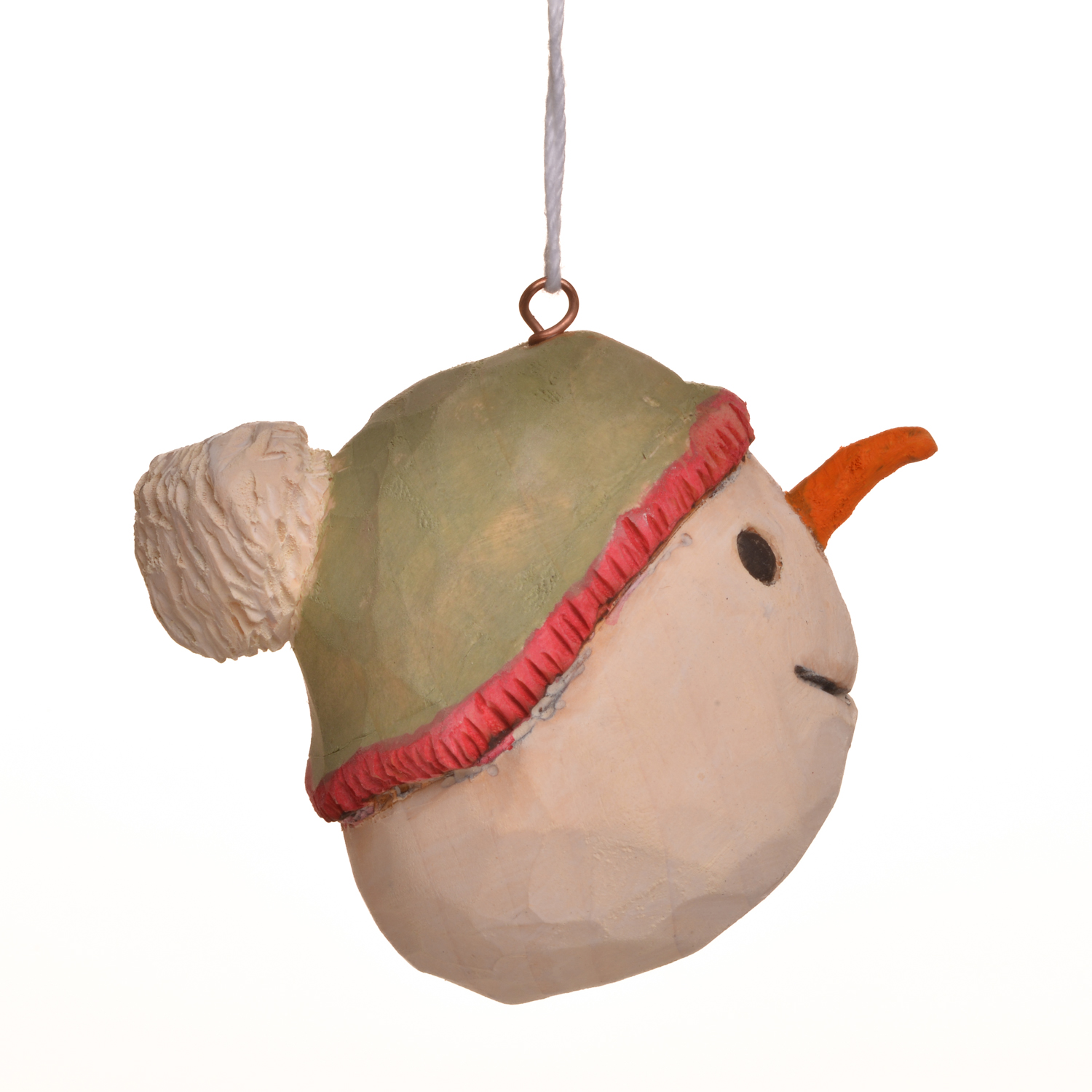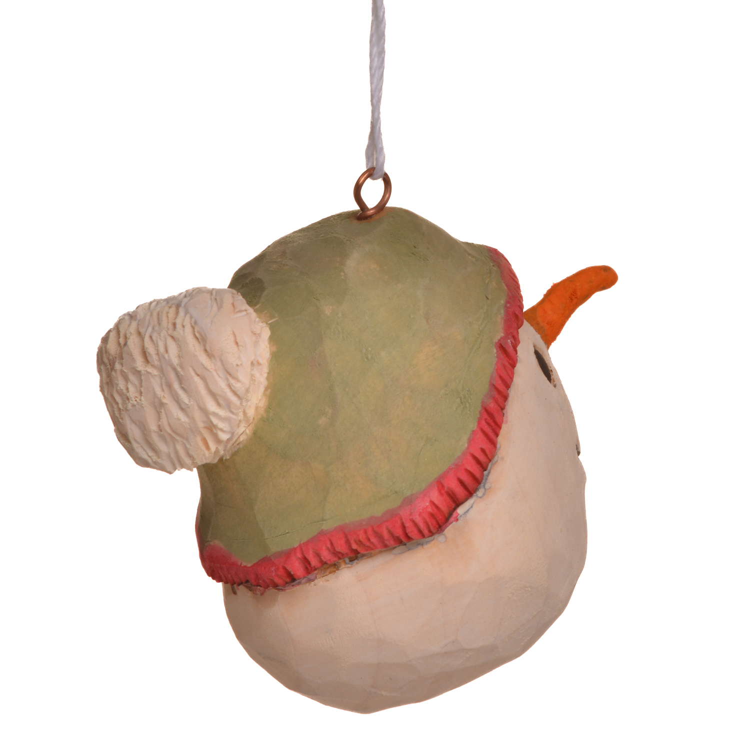 Large hand-carved and painted snowman ornament by Mike Shults of Tennessee. Most of his carvings are made from reclaimed or “junk” wood; his ornaments, in particular, are carved from kindling. Expect differences in facial expression.