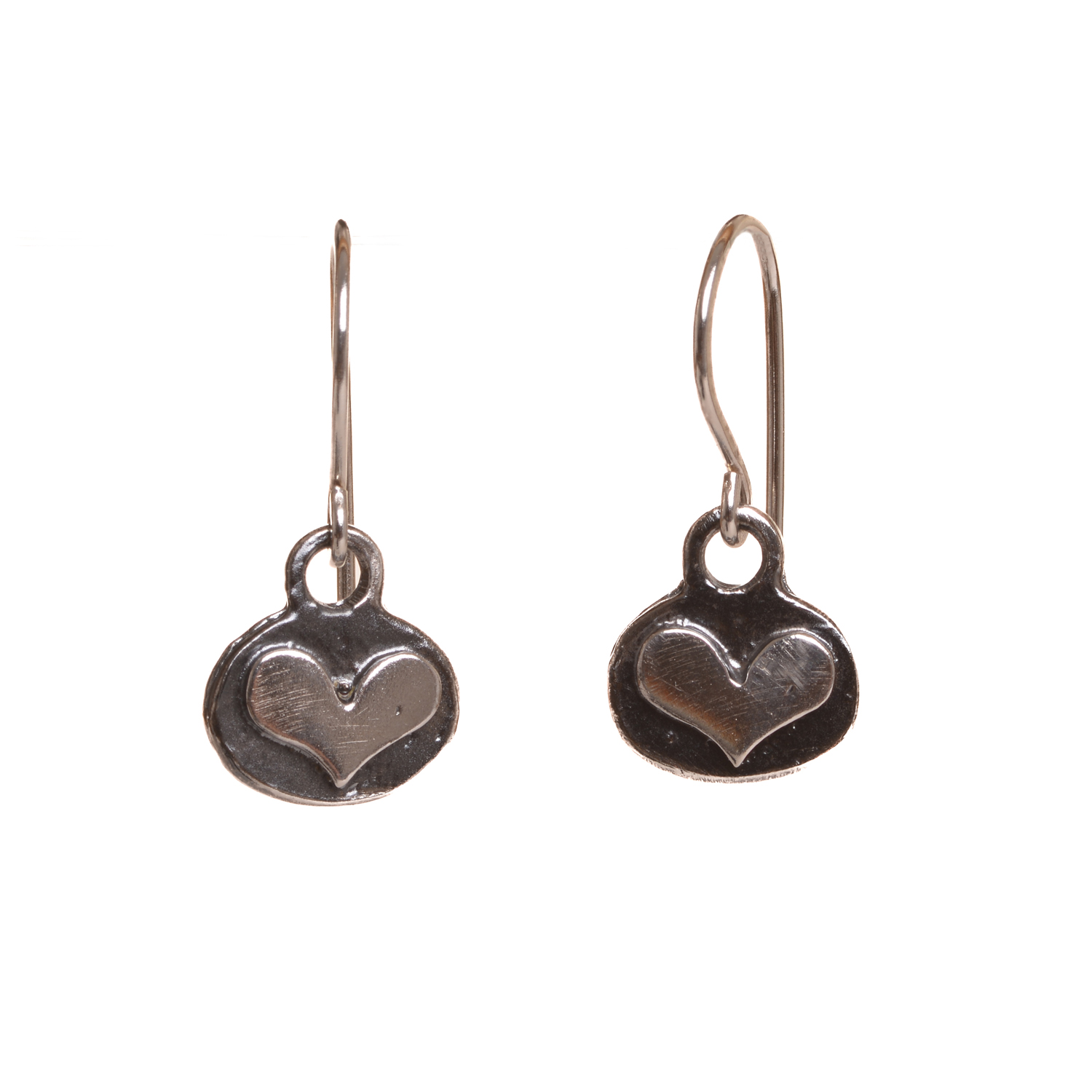 These dainty heart dangle earrings are cast from a granulated original and are cast using the lost wax process. Susan cuts out a heart of fine silver and fuses it to an oval background using the ancient fusing process of granulation. They have a nice weight and look great on!