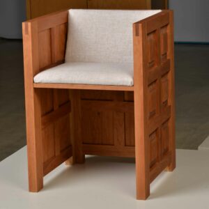 Participating for the first time in the Black and White exhibit is fourth-generation chair caner and heritage craft member, Brandy Clements. While honoring traditional patterns, Clements steps out of the box a little with a maze pattern on an Italian Gio Ponti Chair, while complementing a greek key mosaic pattern. “I wanted to test out variations of adding whites, greys, and blacks to the carousels and see how these gradations worked on a chair seat. The world is never really black and white, after all. Everything is much more convoluted, with many shades of grey.” states Clements. “It was hard not to allude to Black & White issues in a social sense, but chair seat weaving has taught me many life lessons. This exhibit got me thinking that it was really hard to go straight black and white. This chair (and the world) is much more interesting when you make space for the ‘everything in between.'”